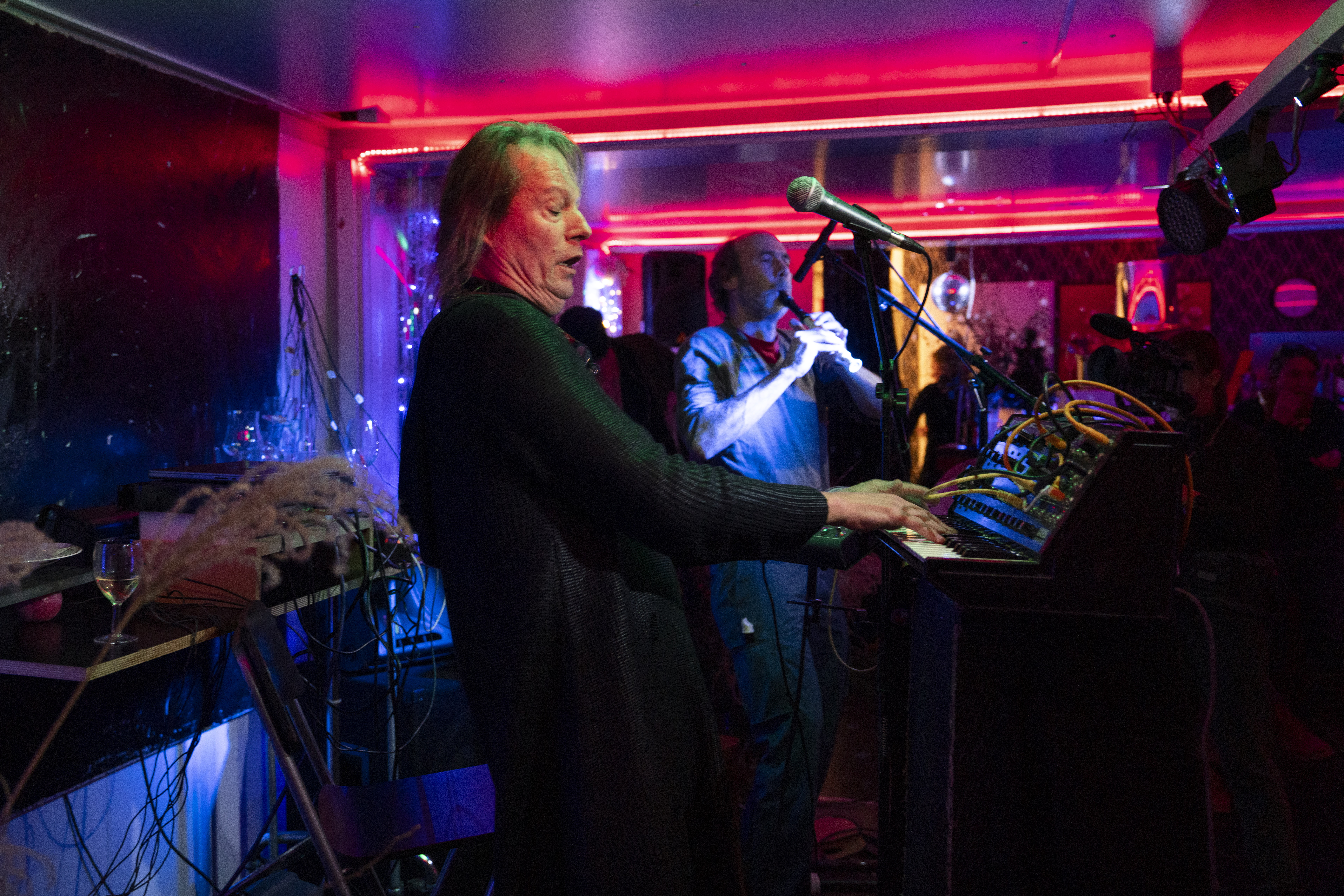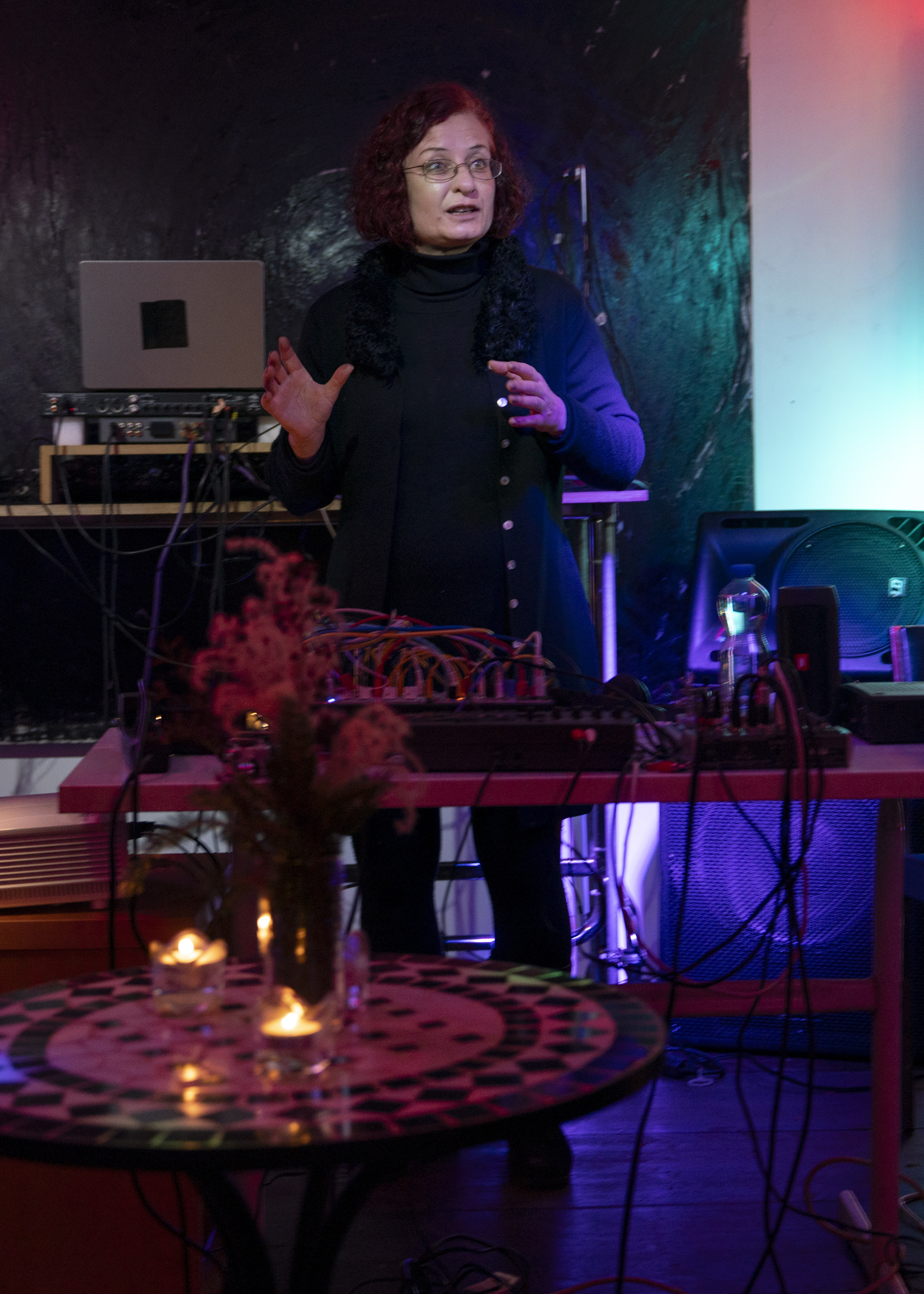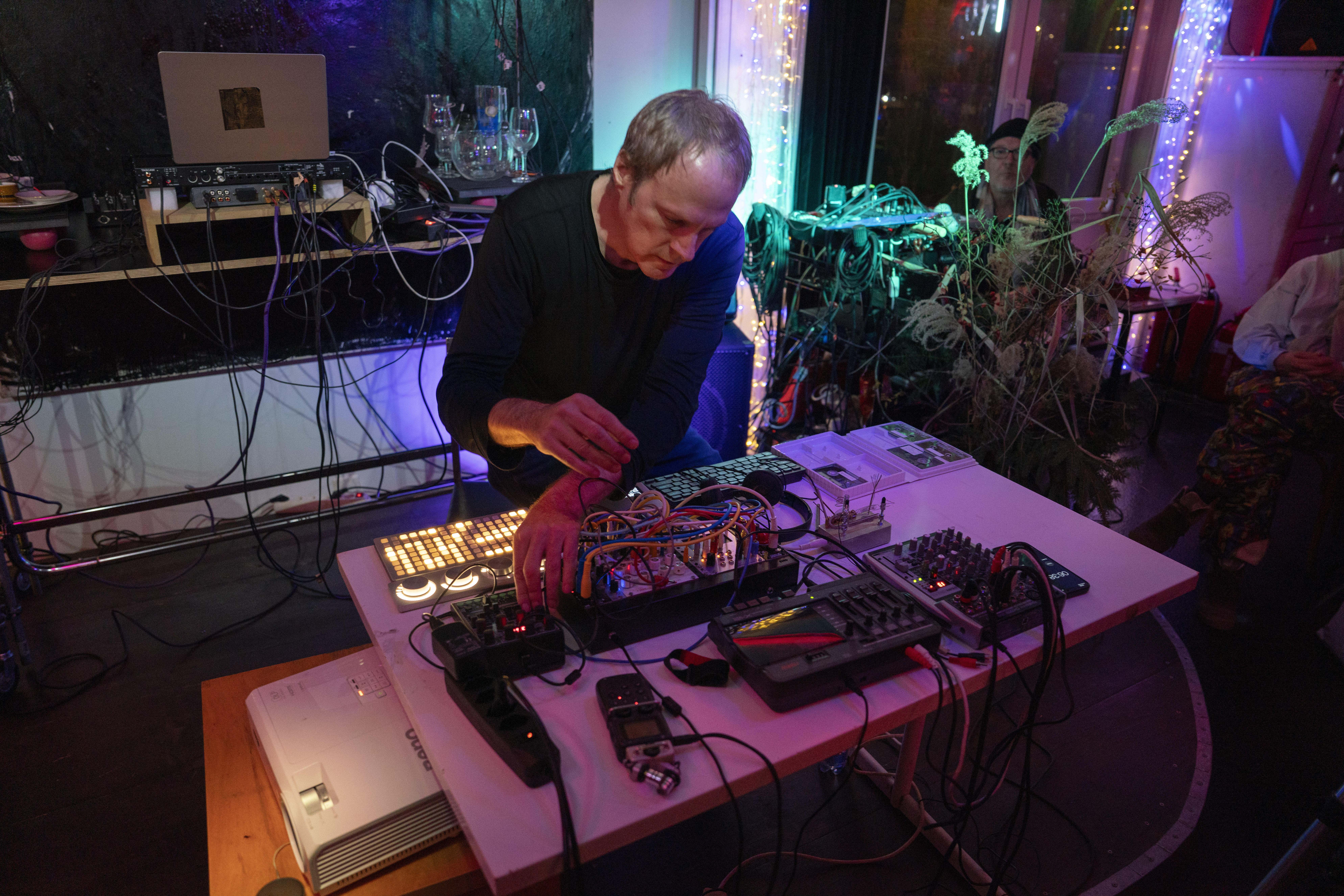 Uhrticken vermischt sich mit metallischem Klirren, ein lautes Rauschen durchzieht den Raum. Raimund Vogtenhuber beugt sich über seine Synthesizer und verteilt seine Noiseboxen im Raum, alienhaft anmutende Klänge schallen aus allen Seiten. Im schwachen Licht sitzen die Gäste an kleinen Tischen, Glühwein und Bier vor sich und lauschen gebannt.