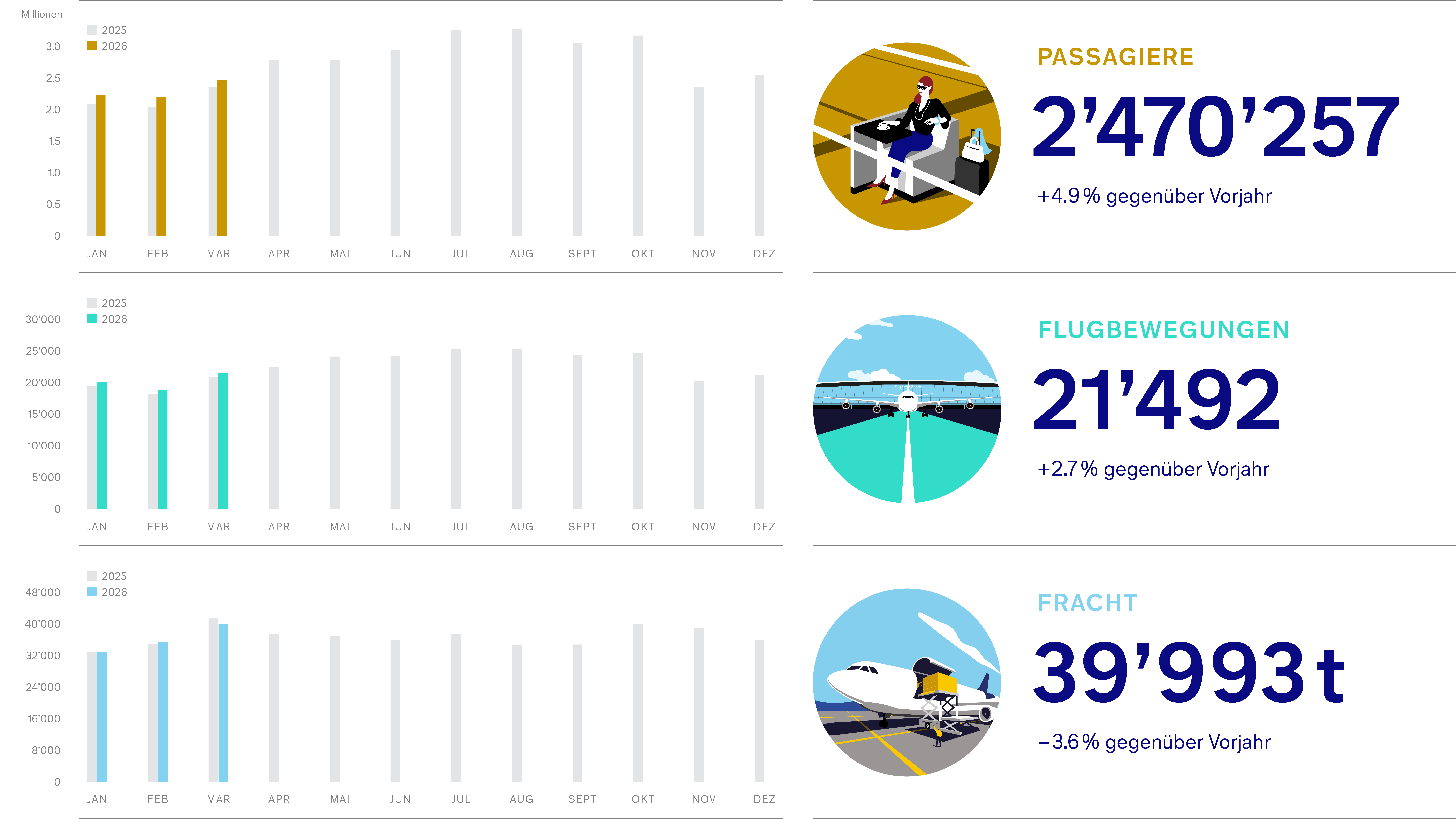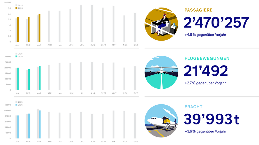Im März sind knapp 2,5 Millionen Passagiere über den Flughafen Kloten geflogen. Das entspricht einem Plus von knapp 5 Prozent gegenüber derselben Periode des Vorjahres. Damit setzt sich der Wachstumstrend in Kloten fort. Die Anzahl Lokalpassagiere lag in der selben Periode bei 1, 6 Millionen. Der Anteil der Umsteigepassagiere betrug knapp 34 Prozent, oder rund 83 000 Passagiere.