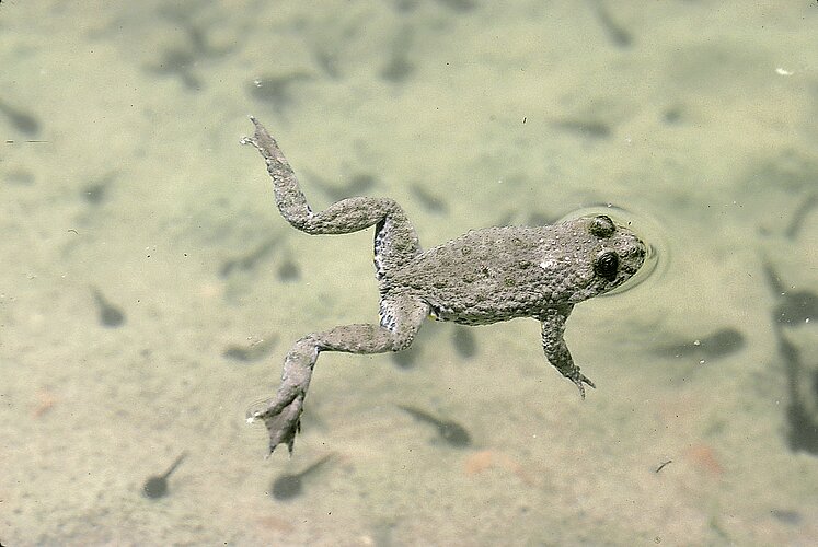 Die Gelbbauchunke und ihr Lebensraum Die Gelbbauchunke gilt gemäss Roter Liste als stark gefährdet. Sie ist nördich der Alpen verbreitet und erscheint im Mai an ihren Laichgewässern. Die Eier werden auf den Gewässerboden gelegt, die Nahrung besteht vorwiegend aus Insekten und Würmern. Als Lebensraum bevorzugt sie vegetationsarme Tümpel, nutzt aber auch stärker bewachsene Gewässer und wassergefüllte Fahrspuren. Entscheidend für die Entwicklung der Kaulquappen ist das Fehlen von Räubern wie Libellenlarven oder Gelbrandkäfern. Geeignete Teiche sollten deshalb periodisch austrocknen oder gefrieren; solche temporären Gewässer gilt es zu erhalten oder neu zu schaffen. |
