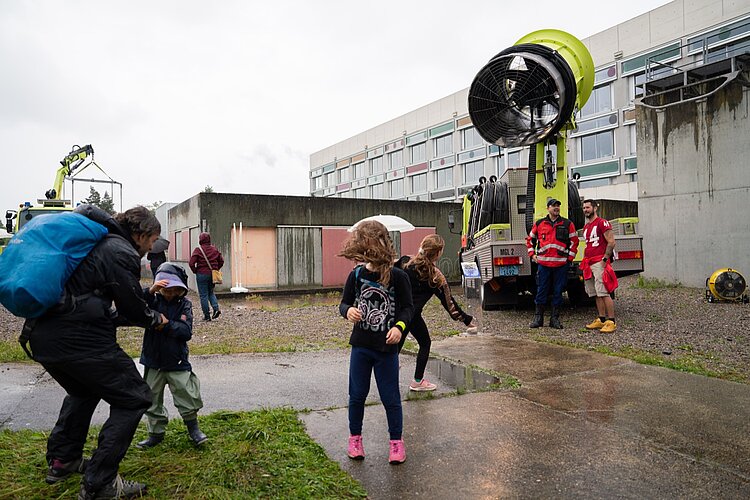 Der mobile Grosslüfter bläst normalerweise Rauch aus Tiefgaragen. Hier sorgt er für frischen Wind – zu Freude der sturmerprobten Kinder. Bilder Dennis Baumann