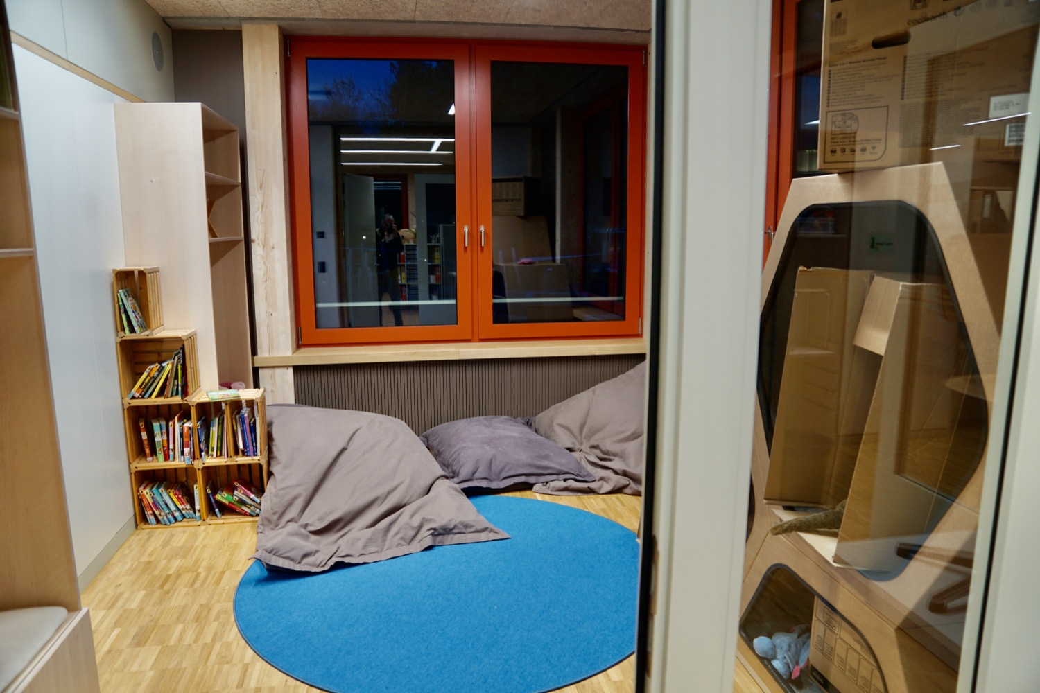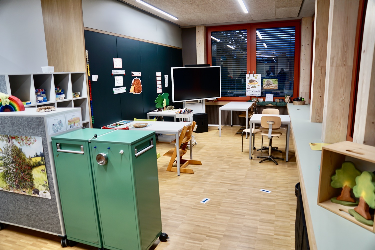 Ebenso ungewöhnlich wie die Turnhalle ist auch das Schulhaus selbst, das neben der Autobahnüberdeckung steht: Anstelle von Klassenzimmern gibt es altersdurchmischtes Lernen in «Lernlandschaften» aus mehreren Räumen, die sich mehrere Kinderjahrgänge teilen und in denen die Kinder motiviert, in ihrem Tempo und entsprechend ihrer Entwicklung spielen und gleichzeitig lernen können, wie Co-Schulleiterin Bea Abegg auf einem Rundgang erläuterte; keine Opfiker Erfindung, sondern im Zürcher Lehrplan 21 als Möglichkeit so vorgesehen. Rund um die zentrale «Spiel- und Lernlandschaft» gibt es eine Garderobe, einen grossen Kindergartenraum, einen für Zahlen, einen fürs Lesen, einen für Bewegung, für Ruhe und fürs Coaching. Betreut werden diese Räume von jeweils drei Lehrpersonen.