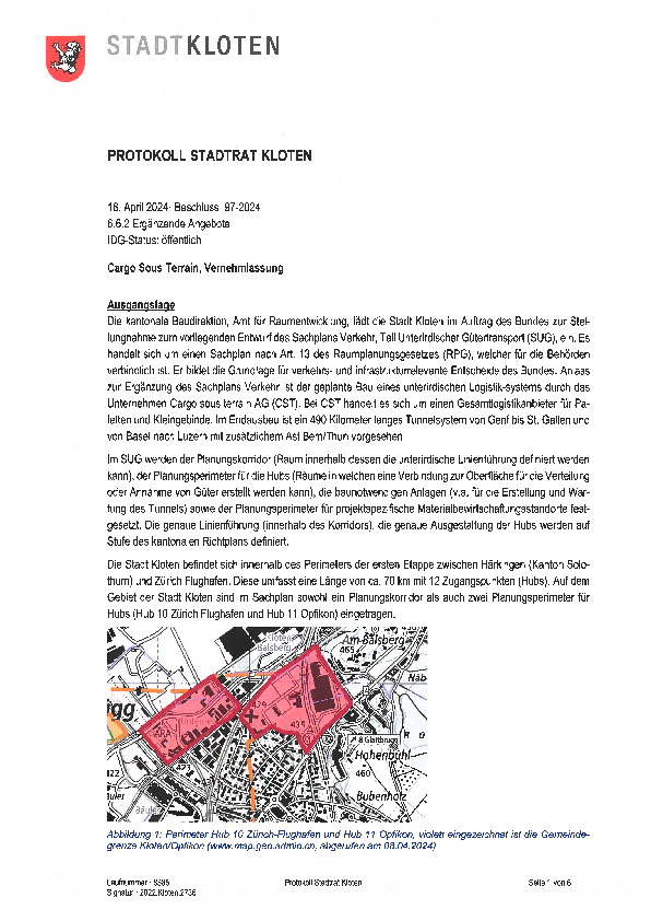 Genau wie Opfikon (und mit der Nachbarstadt abgesprochen) verlangt Kloten eine Aktualisierung der Angaben und Daten, Verkehrsgutachten, welche alle relevanten Umstände berücksichtigten (etwa die Feinverteilung, genannt City-Logistik, Zahlen zu den zusätzlichen Fahrten über die Einfahrt Glattbrugg sowie das geplante Parkhaus Oberhau) und im Speziellen eine unterirdische Erschliessung beider Hubs über die Autobahn, um die bestehenden Strassen nicht noch mehr zu belasten. Auch die Lager- und Umschlaganlagen sollen unterirdisch sein, wie im direkten Austausch mit den Verantwortlichen so vorgestellt.