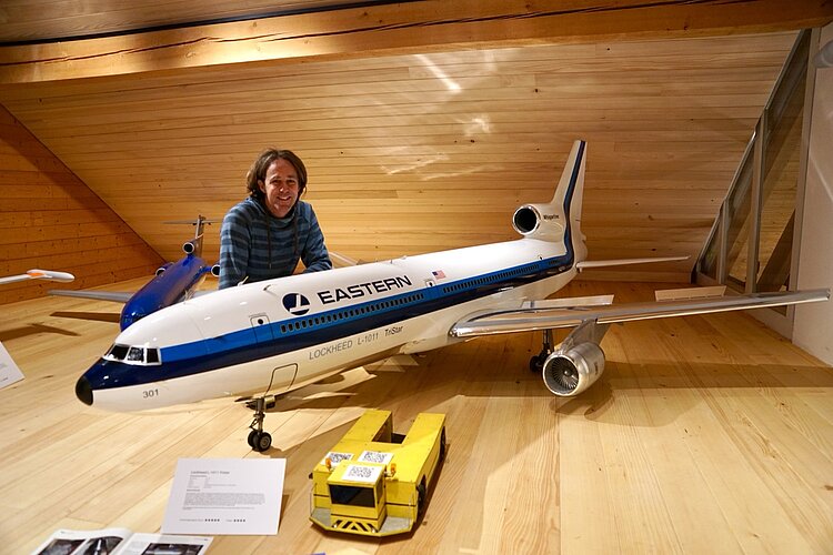 Sein bisher grösstes und ambitioniertestes Fluggerät ist eine Lockheed L-1011 Tristar. Das Vorbild des Grossraumflugzeugs verfügt über drei Triebwerke und flog von 1972 bis 2001, als Konkurrenz zur McDonnell Douglas DC-10, die als Modell im Massstab 1:16 käuflich ist. «Ich wollte deshalb etwas anderes», begründet Dominik Escher seine Wahl. Und das wurde es auch. Er baute so ziemlich alles selbst original- und funktionsgetreu nach: die einziehbaren und gefederten Fahrwerke (das Modell wiegt 20 Kilo), die Flügel mit sämtlichen und funktionierenden Klappen und absenkbaren Vorflügeln (für Start und Landung), selbst das Düsentriebwerk im Heck ist ein Eigenbau. «Dank der leichteren Materialien kann man heute sogar die Aerodynamik der Vorbilder übernehmen», erklärt Dominik Escher, der von Beruf Werklehrer ist.