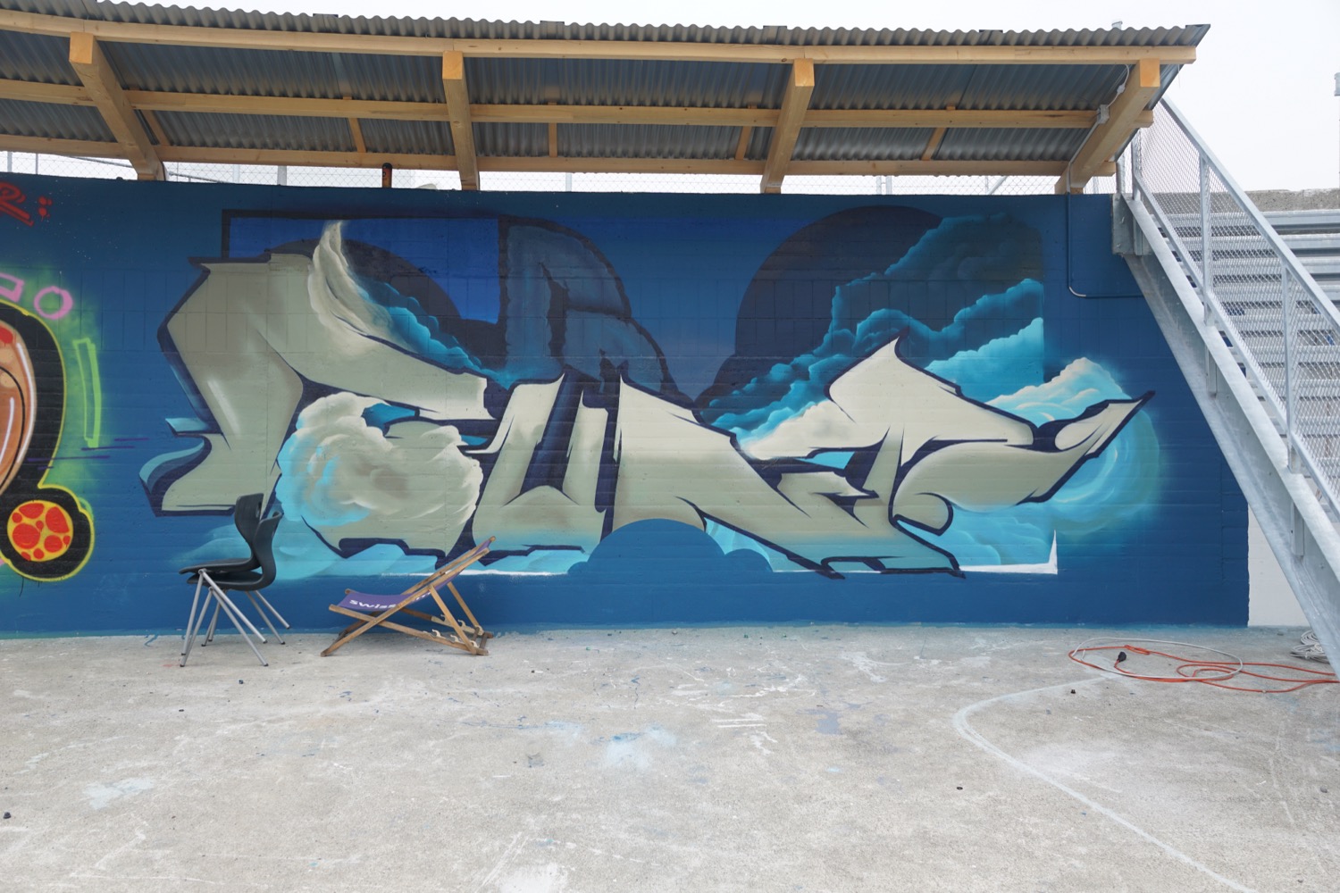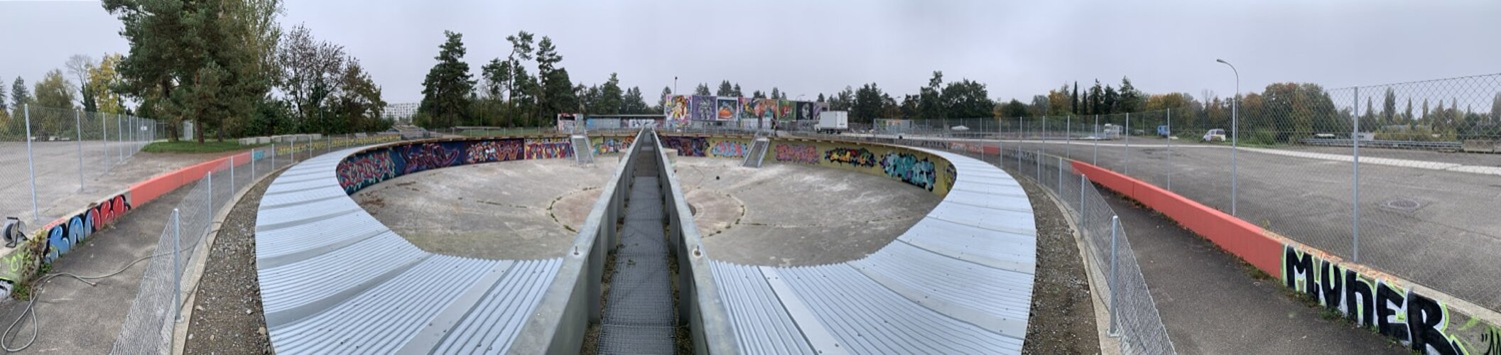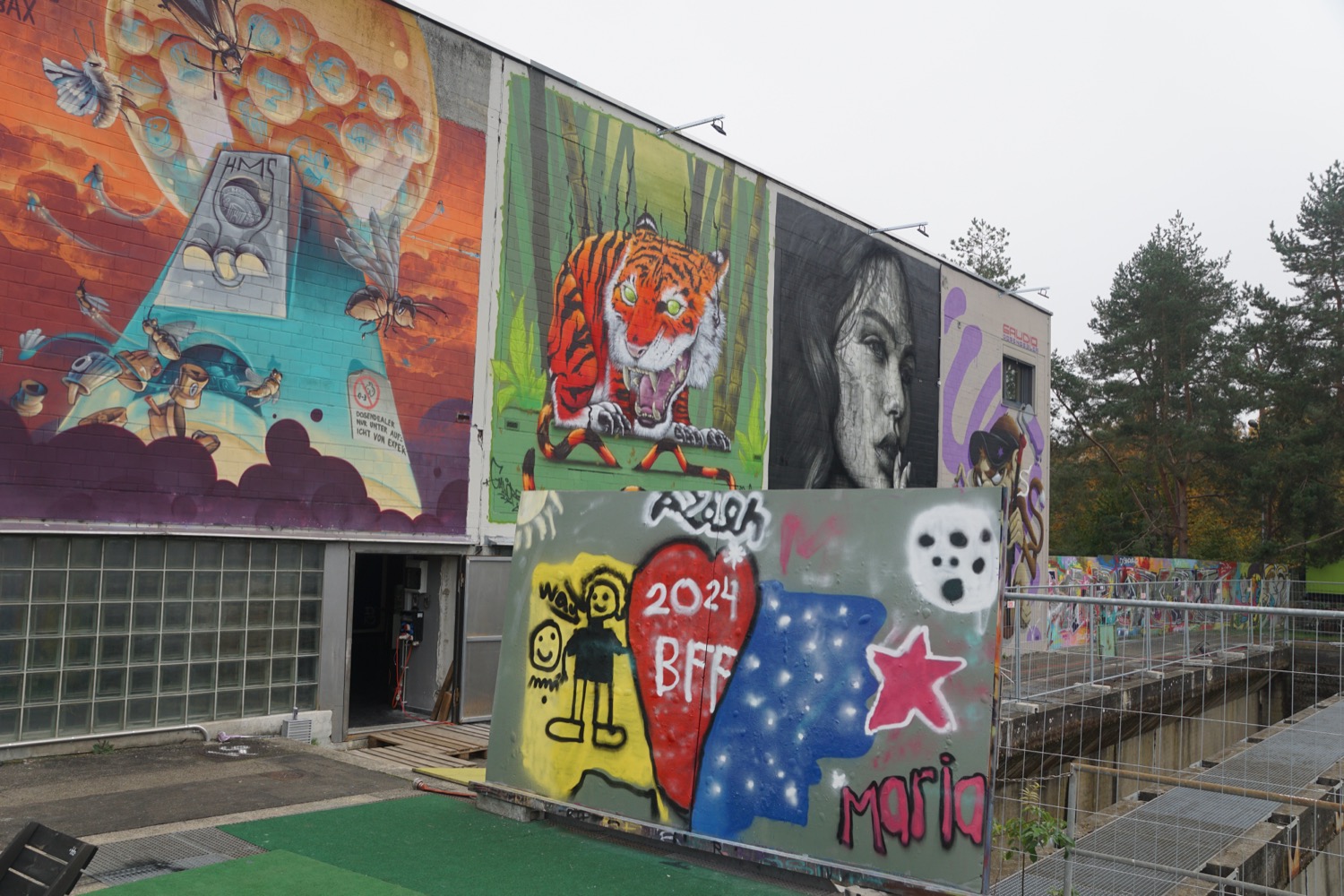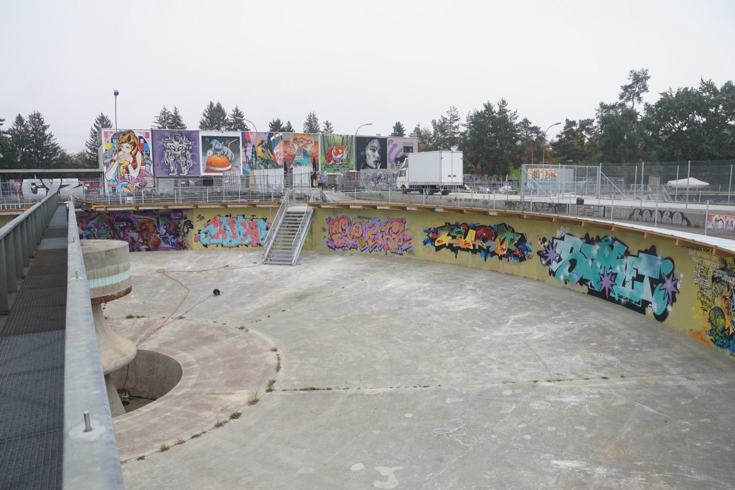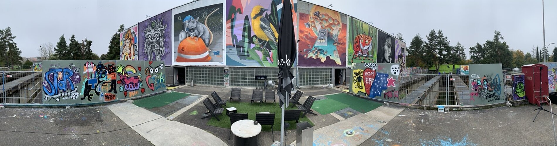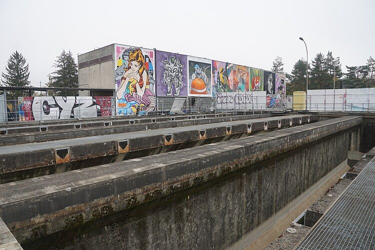 Die augenfälligste ist derzeit das Vordach über den kreisrunden ehemaligen Klärbecken. Es schützt Künstler und Werke nicht nur vor Wind und Wetter (auf nassen Wänden hält die Farbe nicht gut), sondern enthält auch eine Beleuchtung, damit man nicht allein auf Tageslicht angewiesen ist. Aus Sicherheitsgründen erhielten die Becken zudem einen Zaun rundherum sowie zwei metallene Treppen ins Innere.