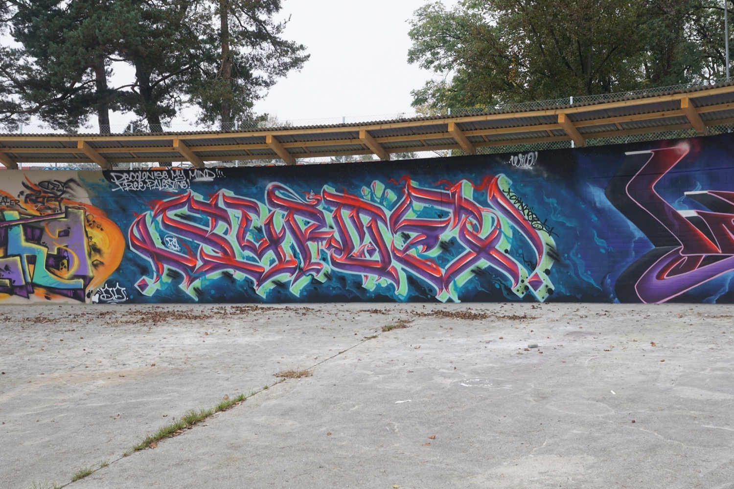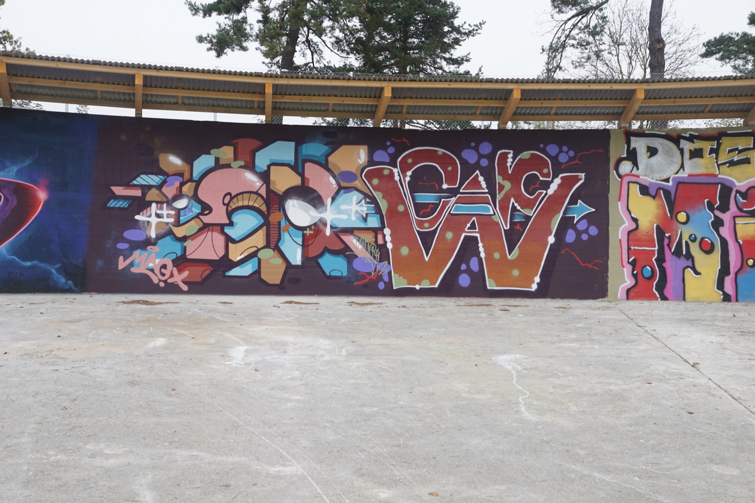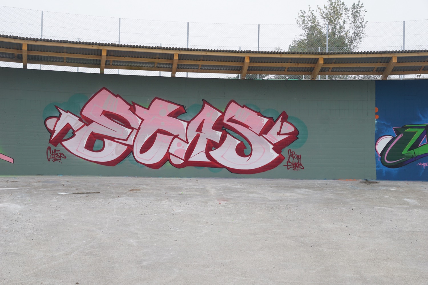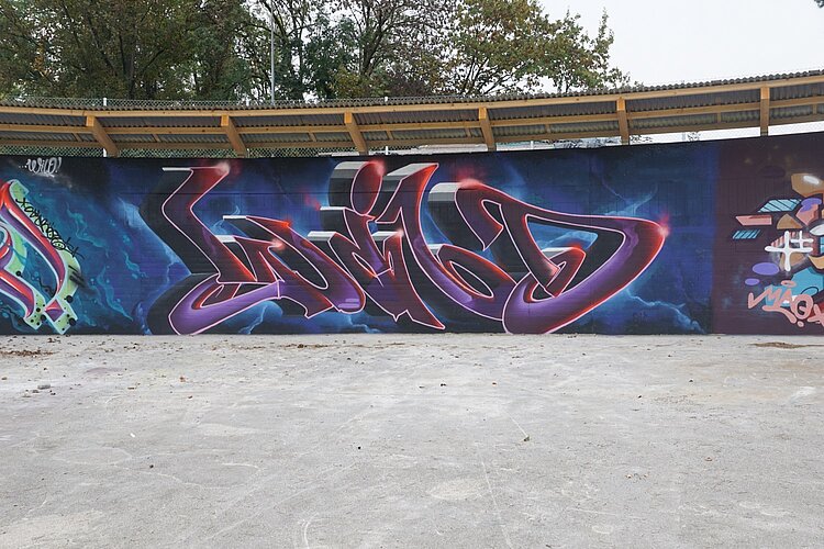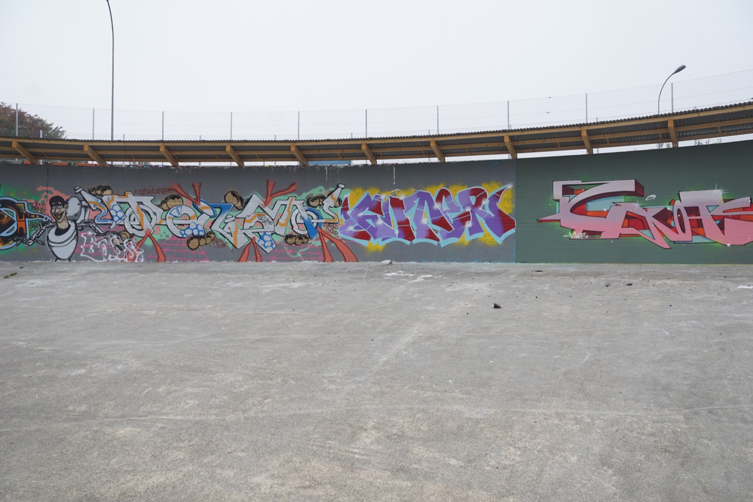 Die augenfälligste ist derzeit das Vordach über den kreisrunden ehemaligen Klärbecken. Es schützt Künstler und Werke nicht nur vor Wind und Wetter (auf nassen Wänden hält die Farbe nicht gut), sondern enthält auch eine Beleuchtung, damit man nicht allein auf Tageslicht angewiesen ist. Aus Sicherheitsgründen erhielten die Becken zudem einen Zaun rundherum sowie zwei metallene Treppen ins Innere.