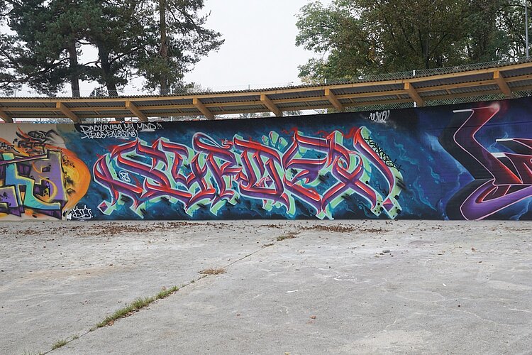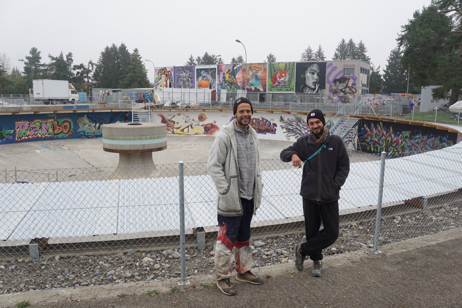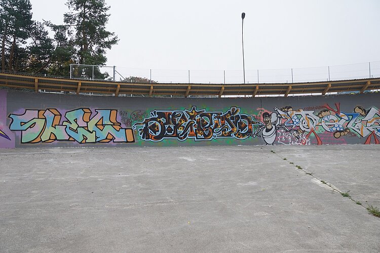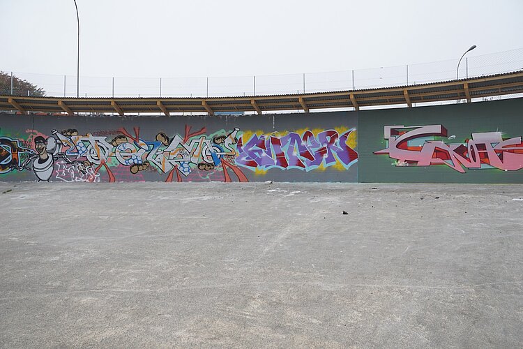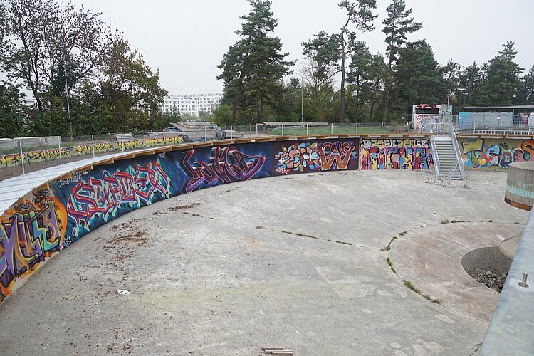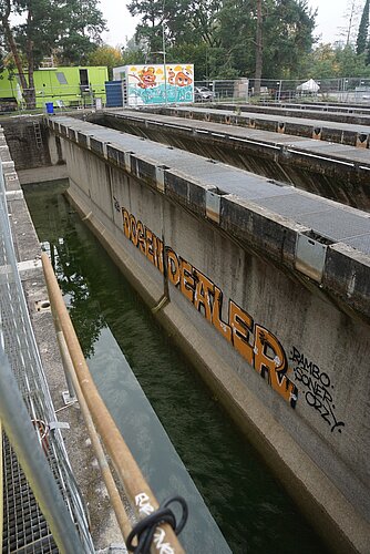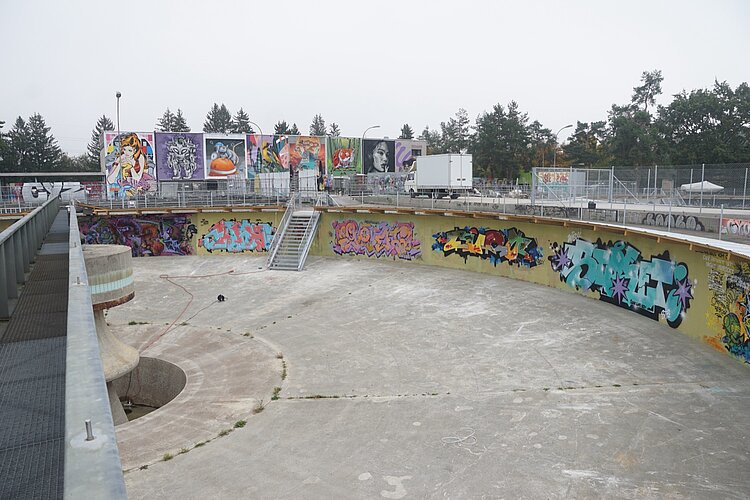 Nicht nutzen können die Sprayer die mehrere Meter hohen Betonwände der rechteckigen Becken. «Sie wurden gebaut, um im Wasser zu stehen», erläutert Yassin Tair. «Und nun sind sie seit Jahren praktisch im Trockenen.» Der beauftragte Ingenieur hatte Bedenken, dass die Statik der ohnehin sanierungsbedürftigen Wände darunter gelitten hat. So entschlossen sich Yassin und Till, die tiefen Schächte dazwischen aufzufüllen und den Platz nur in der Horizontalen zu nutzen, unter anderem für die erwähnten Ateliercontainer.