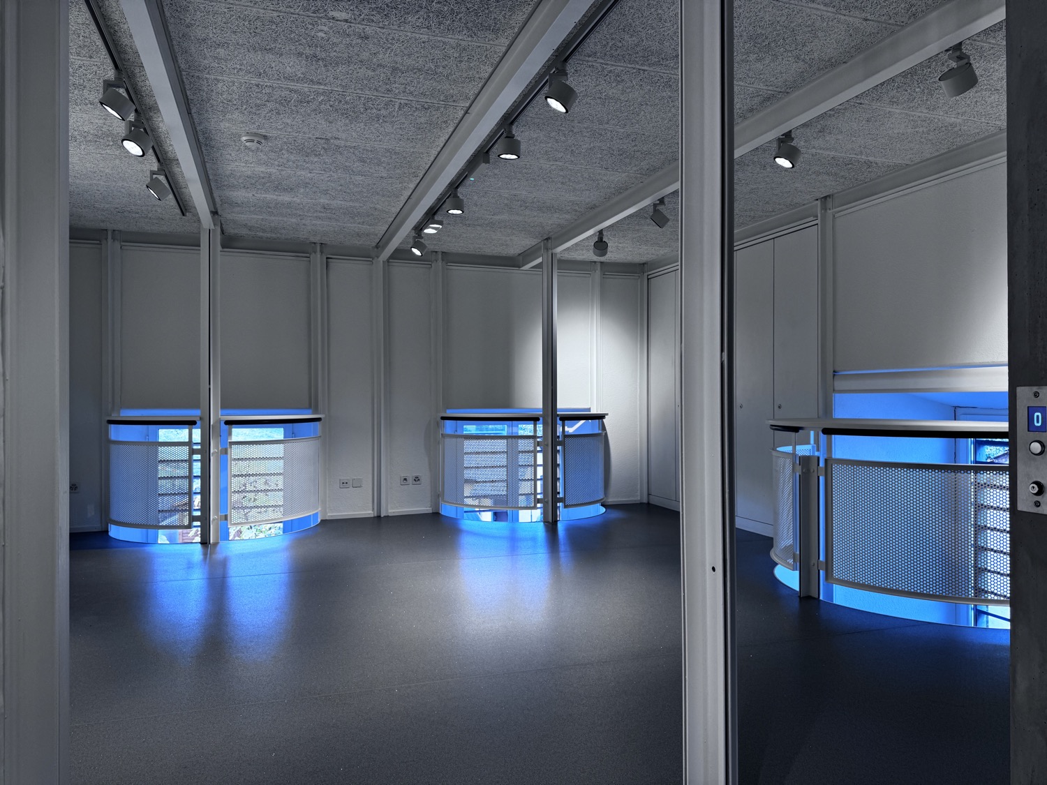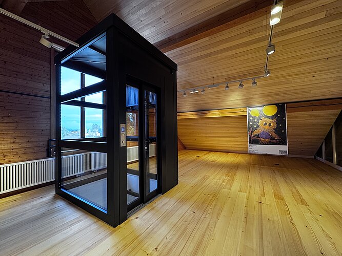 Der grösste Umbauposten im Haus war der Lift, durch den das Gebäude nun komplett im Rollstuhl erfahrbar ist. Der Liftschacht – im unteren Teil Sichtbeton, im Dachgeschoss eine Stahl- und Glaskonstruktion – bewegt sich deshalb langsam und führt dort entlang, wo einst eine interne Wendeltreppe die Galeriegeschosse untereinander verband.
