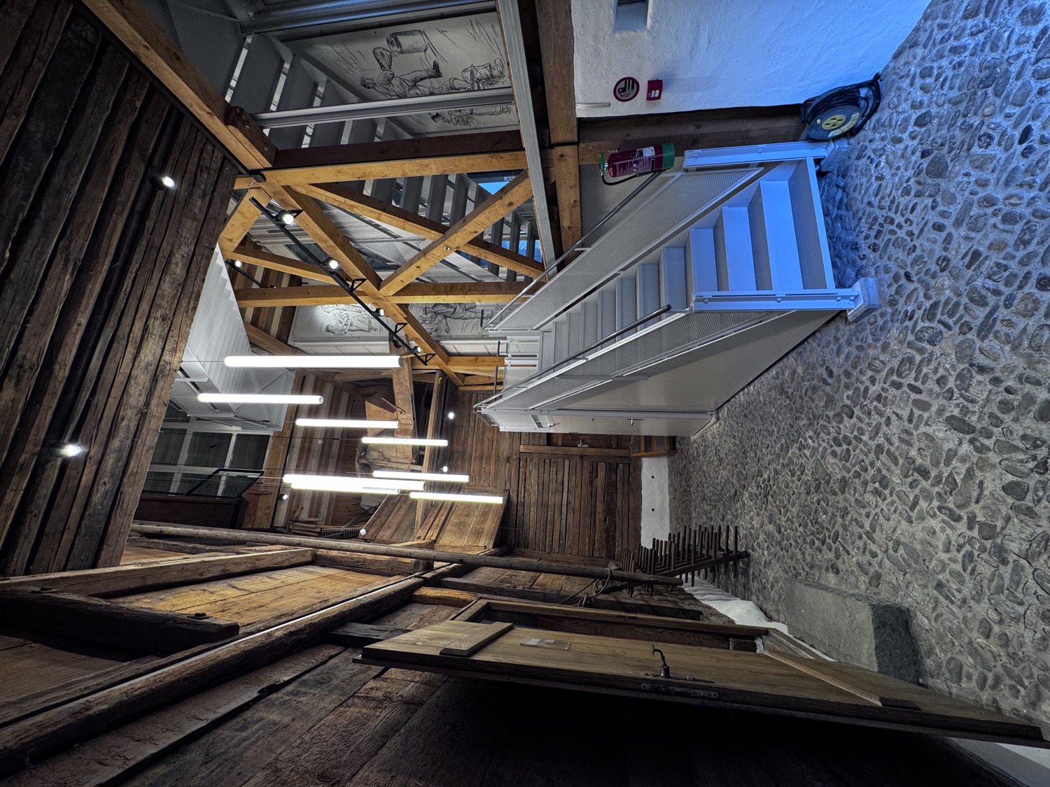 Ansonsten wurde im «Tenn», dem hohen Raum hinter dem Scheunentor, der sich bis unters Dach zieht, wenig verändert: Die Holzwände und -balken bieten Platz für grosse Ausstellungsstücke des Ortsmuseums. Die modernere, metallene Treppe erhielt einen neuen Anstrich, die anschliessende Innenkonstruktion mit drei Etagen für die Galerie wurde lediglich statisch verstärkt. Sie erhielt aber wie das übrige Haus eine Beschallung und komplett neue Beleuchtung – in der Galerie und den Museumsräumen als LED-Spotlampen, um die Exponate ins rechte Licht zu rücken; im Tenn als lange, hängende Leuchtstäbe (warmweiss und schöner als das frühere «World’s largest timepiece» an der Zürcher Bahnhofstrasse) und im «Beizli» als stimmungsvolle Leuchtringe für direkte und indirekte Beleuchtung.