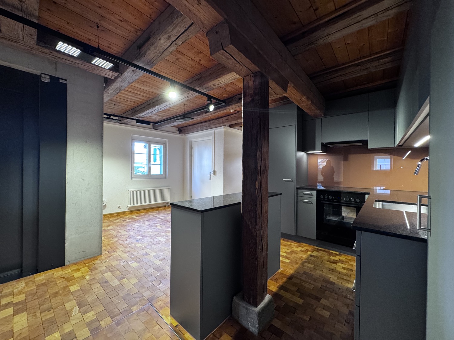 Die Galerie selbst erfuhr wenig Änderungen: Selbst die «Spaghetti-Platten» (Dämmplatten aus Holzfasern als Deckenverkleidung) wurden wiederverwendet. Auch das Erdgeschoss der Galerie wurde sanft erneuert: Der Boden, bestehend aus eng aneinandergelegten Stirnholzparkett-Klötzen, wurde abgeschliffen und geölt; ersetzte Teile sind aus etwas hellerem Holz. «Das darf man ruhig sehen», findet Architekt Mario D’Alberto. Neu ist die kleine Küche, welche es erlaubt, hier etwa Vernissagen-Apéros zuzubereiten, und das IV-gerechte WC. Auf der Bergseite des Tenns führt eine bestehende Tür in den Korridor, der seinerseits das «Beizli» erschliesst. Auch dort hat sich auf den ersten Blick wenig verändert. Die bereits erwähnten Lampen leuchten aber wahlweise nach unten, oben oder beides – was den Charakter des Raumes mit den rohen Steinwänden besonders betont.