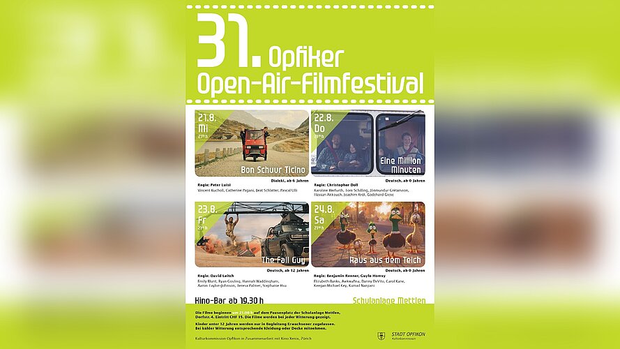 Auf dem Pausenplatz der Schulanlage Mettlen findet Mitte August das 31. Opfiker Open-Air-Filmfestival statt. Besucherinnen und Besucher erwartet ein buntes Kinoprogramm – von Action über Drama bis zu Komödie.