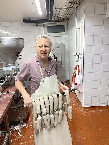 Ende Januar bereitet Franz Arnold (Bild) zum letzen Mal Treberwürste zu. Die Spezialität aus dem Berner Seeland gehört zum Treberfest, welches die Rebberg-Genossenschaft jeweils im Februar ausrichtet. Per 1. August übergibt Franz Arnold nach 37 Jahren den Betrieb an seinen ehemaligen Lehrling, aktuellen Mitarbeiter und Teilhaber Christian Bauer sowie seinen Geschäftspartner Ramon Singer. Die beiden wollen Treberwurst und weitere Traditionen in der neuen Stadtmetzgerei Arnold weiterführen. (rs.) Bild rs.