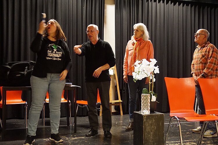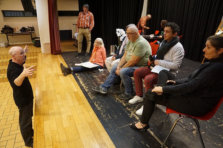 Auch an diesem Probenabend lernen die Teilnehmenden viel über die Schauspielerei, die Arbeit auf der Bühne, ihren Bühnencharakter und über sich selbst. Sie lernen, wer wann wo stehen und wann was sagen muss, damit aus den Texten echte Dialoge werden, wie sie im Alltag der Menschen stattfinden können.