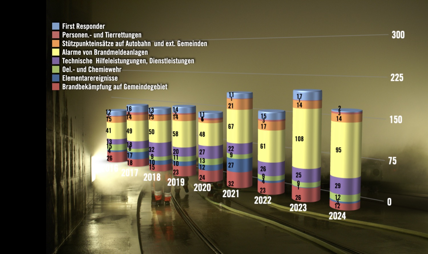 Je 12-mal ging es um Öl- oder Chemiewehr (meist ausgelaufene Stoffe auf Strassen) und die erwähnten Brände auf Stadtgebiet. Nur vereinzelt wurden Personen und Tiere gerettet, Elementarereignisse bekämpft oder wurde Erste Hilfe bei Kreislaufzusammenbrüchen geleistet.