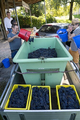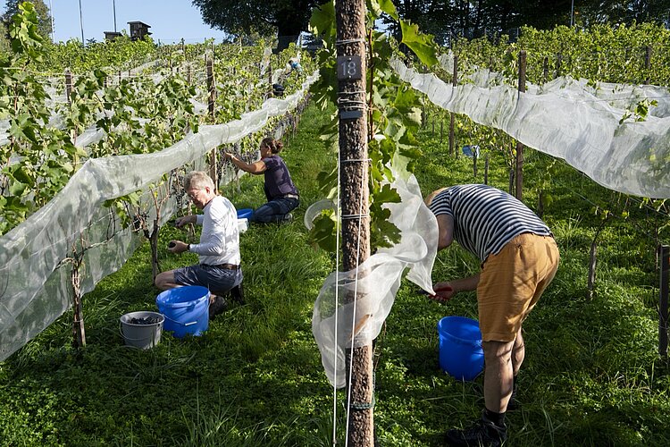 Rebmeister Werni Brunner begutachtet zufrieden die Rebstöcke: «Die Trauben sind lockerbeerig und kein Schädlingsbefall ist zu sehen. Ein wunderbares Ergebnis», erklärt er sichtlich erfreut. Auch die anderen Genossenschafter pflücken mit zufriedenen Mienen Traube für Traube und füllen dabei entspannt plaudernd einen Kübel nach dem anderen.