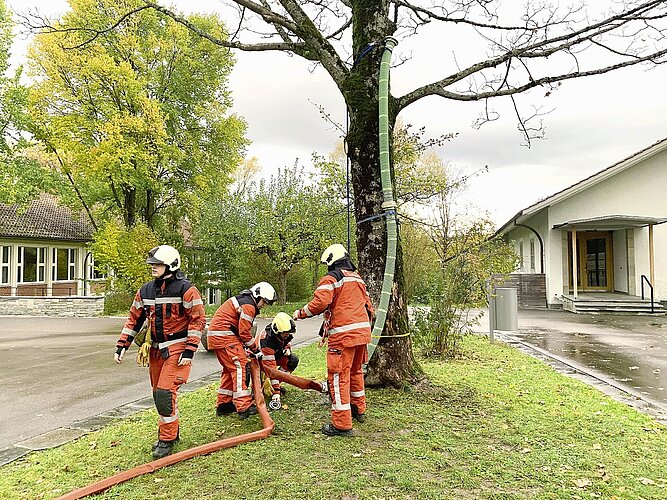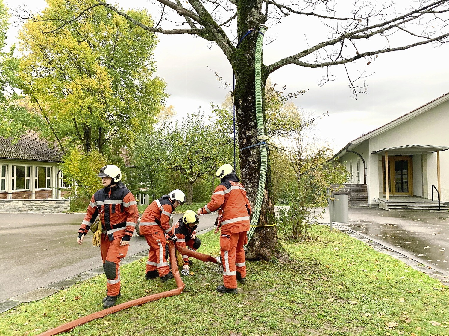 Im ersten Versuch scheitert die Gruppe, weil die Distanz vom Hydranten zum Baum zu gross ist. Nachdem man aber die Köpfe nochmals zusammengesteckt hat, kommt man zur erhofften Lösung. Einer der langen Schläuche wird am Hydranten mit Wasser gefüllt, verschlossen und danach zu Fuss zum Fahrzeug transportiert. Ein Ende des Schlauches hängt man an die Drehleiter, das andere wird mit dem unteren Ende des am Baum befestigten Schlauches verbunden. Auf beeindruckende Art und Weise wird die Autodrehleiter nun mehrere Meter in die Höhe bewegt, bis der steigende Druck das Wasser im vollen Schlauch nach unten und in den angeschlossenen kleinen Schlauch presst, bis es oben rausfliesst.