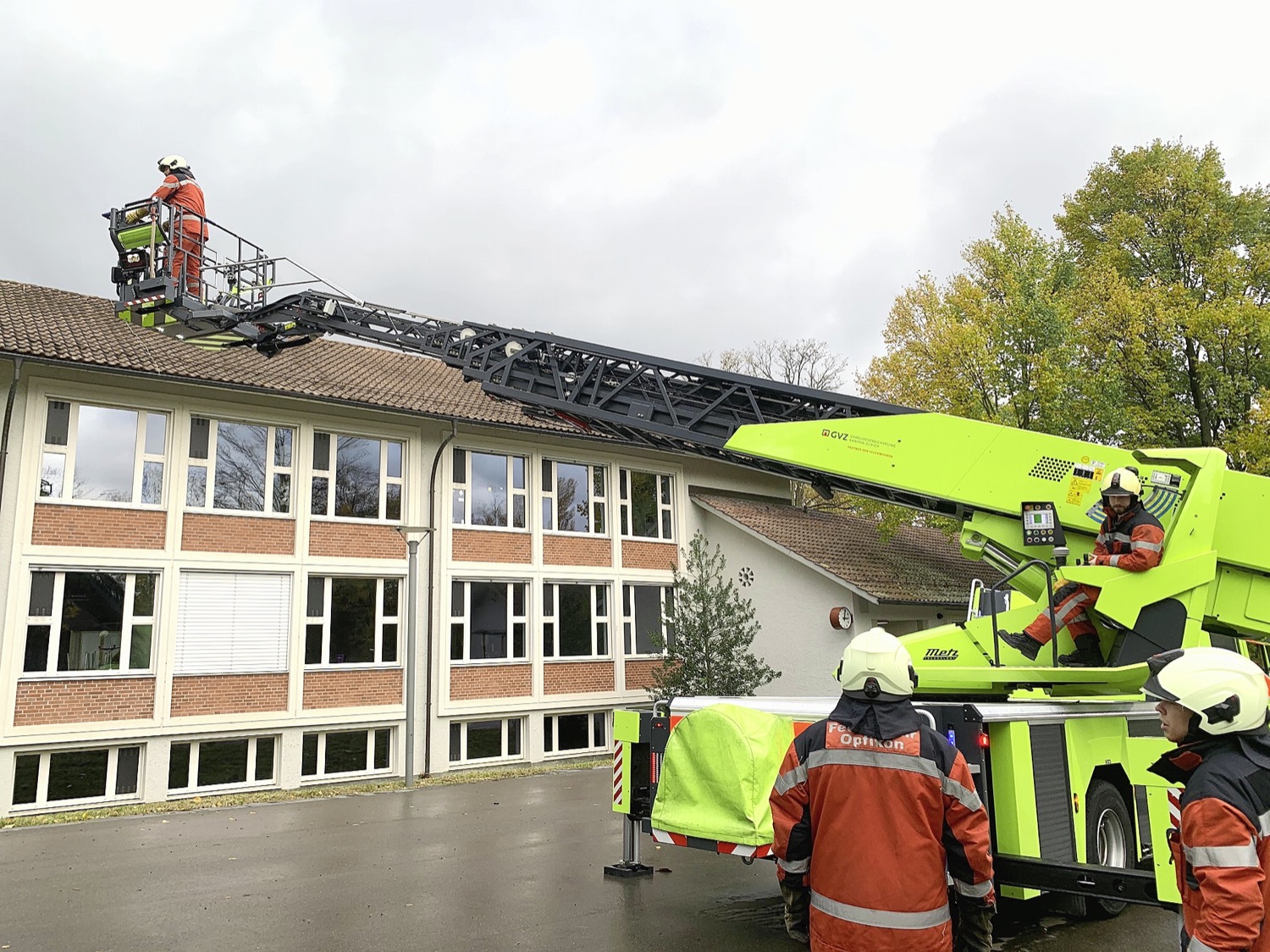 Mit der Autodrehleiter erreicht man auch Brandherde auf Dächern. In der Übung erfüllte sie aber eine andere Aufgabe. Bilder Robin Walz