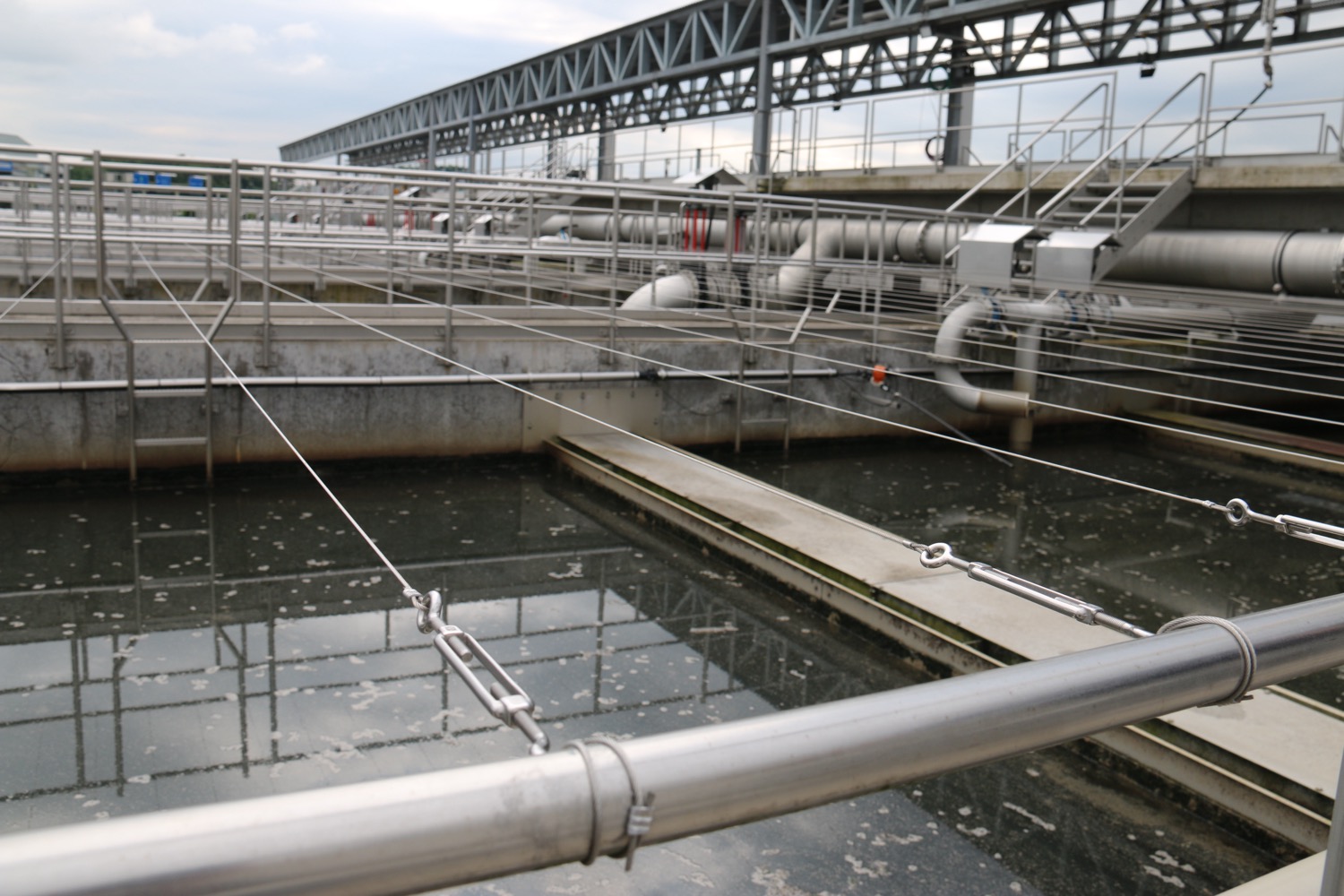 «Immer wieder überlegten wir uns, wie wir unsere Becken für die Vögel unwirtlicher gestalten können», so Michael Kasper. Unter anderem wurde ein Versuch mit einer akustischen Vergrämungs- und Ultraschallanlage durchgeführt. Die Geräte waren aber nicht so wirkungsvoll wie gedacht und vor allem war der stetig ertönende Klang sehr anstrengend für die Ohren unter anderem der vielen Bauarbeitenden vor Ort. Die intelligenten Möwen hingegen merkten sehr schnell, dass der Ton für sie keine Gefahr bedeutete, und liessen sich nicht mehr von ihrem Schlemmermahl abhalten. «Nun haben wir zusammen mit der Firma Anticimex aus Kloten eine simple, aber effektive Lösung für das Problem gefunden», freut sich der Betriebsleiter Michael Kasper. Über alle offenen Wasserflächen wurden Drähte in Abständen von 30 Zentimetern gespannt. So wird den Möwen der Weg ins Wasser versperrt. «Müssen wir in die Becken einsteigen, können diese Drähte unkompliziert entfernt und wieder gespannt werden.»