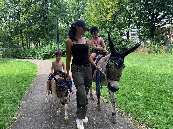 Inzwischen sind die 7-jährige Shqipe und der 4-jährige Arcan vom «Ausritt» auf den Eseln zurückgekehrt – und begeistert: Sie wollen nachher auch noch mit den Pferden eine Runde drehen. Vorerst wartet aber noch ein knappes Dutzend anderer Kinder auf diese Gelegenheit. Um die Tiere zwischendurch etwas zu schonen, lösen sich Esel und Pferde nämlich ab – was von einigen wartenden Kindern mehr Geduld erfordert, als diese aufbringen können.