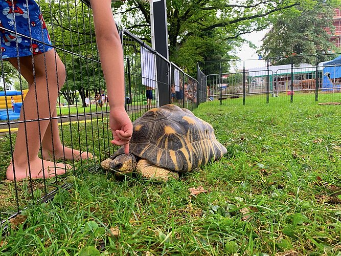 Klar gibt es exotischere Tiere zum Bestaunen. Dafür kann man diejenigen, welche jeweils die Sommerferien im Freizeitbad abschliessen, hautnah erleben: Die Lamas Milkyway und Ragusa, die Zwergziegen Bo und Covid, die Schildkröten Raul, Jakob und Sir Henry, die Esel Moustique und Apollo 13, die Pferde Delia und Lady sowie das Pony Chouchou, sie alle durften gestreichelt werden. Aber bringt das etwas bei den Schildkröten? «Die Tiere sind sehr empfindsam, sie spüren das auch durch den Panzer», weiss Cornelia da Silva. Sie ist nicht nur Besitzerin dieser Tiere, sondern auch des Zoos Hasel im aargauischen Remigen, wo sie sonst wohnen. Für diese Woche hat sich die Tierfreundin mit einer Kollegin in der Badi eingerichtet: Geschlafen wird im Zelt gleich neben den Gehegen, damit die Betreuung der Vierbeiner rund um die Uhr sichergestellt ist. «Eine Vorschrift des Veterinäramtes», erläutert Cornelia da Silva. Ausserdem müssen genügend Wasser, Schatten und Ruhezonen vorhanden sein. All das bietet das Freizeitbad Opfikon im hinteren Teil mit den grossen Rasenflächen und dem alten Baumbestand. «Ideal», findet da Silva, die mit einigen ihrer Zootiere jedes Jahr zwei oder drei Orte besucht – von der Gewerbemesse bis zum Weihnachtsmarkt. Ausserdem ist sie öfters mit dem Lama- oder Eseltrekking unterwegs.