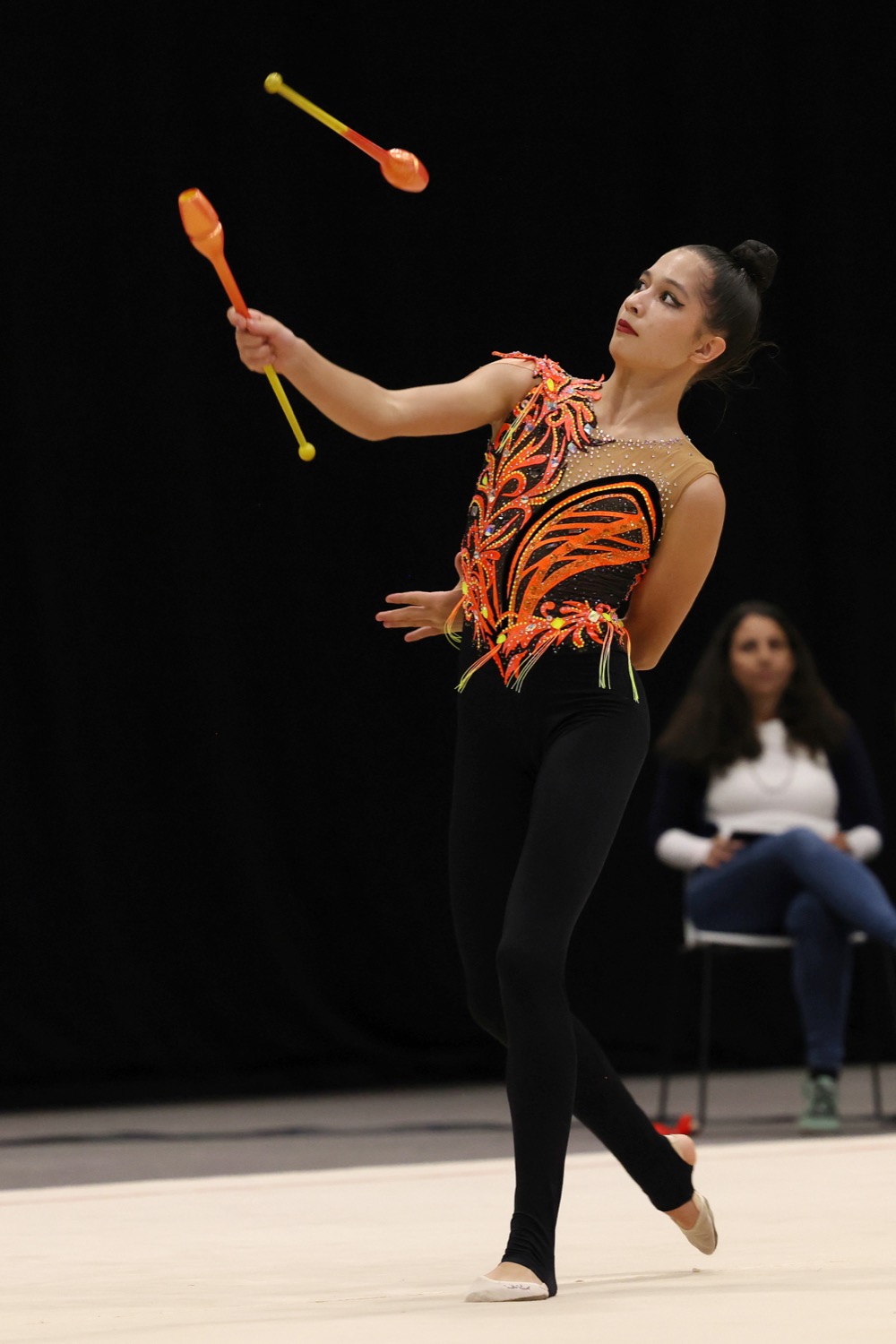 Mit 3,3 Punkten Vorsprung gewinnt Tamila Marushchak für Opfikon den Mehrkampf der Kategorie Pre-Junior P4. Marushchak überzeugt, wie sie mit einer Leichtigkeit Schwierigkeiten aneinanderreiht, als wäre es ganz einfach. Dabei lässt sie zum Beispiel die Keulen ausserhalb ihres Gesichtsfeldes kreisen, währenddem sie sich mehrfach um die eigene Achse dreht.