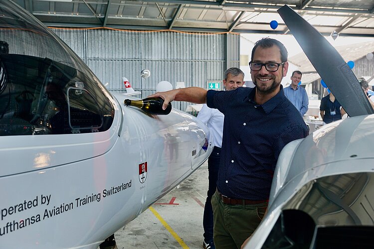 Roman Schmid begiesst die neue Diamond DA42 mit Prosecco. Hinten links: Carsten Mangasser, Leiter der Lufthansa-Flugschule. Bilder Roger Suter
