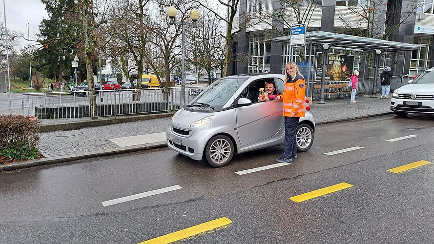 Die Stadtpolizei hat am Freitag vor dem Samichlaustag um die Mittagszeit im Zentrum Glattbruggs rund 30 Fahrzeuge und Papiere kontrolliert. Beanstandungen gab es keine – dafür für alle ein Chlaussäckli. Mit solchen Aktionen will die Stadtpolizei für Sicherheit im Strassenverkehr sensibilisieren und gleichzeitig den (positiven) Kontakt zur Bevölkerung pflegen – was ihr offensichtlich gelingt. Bild zvg