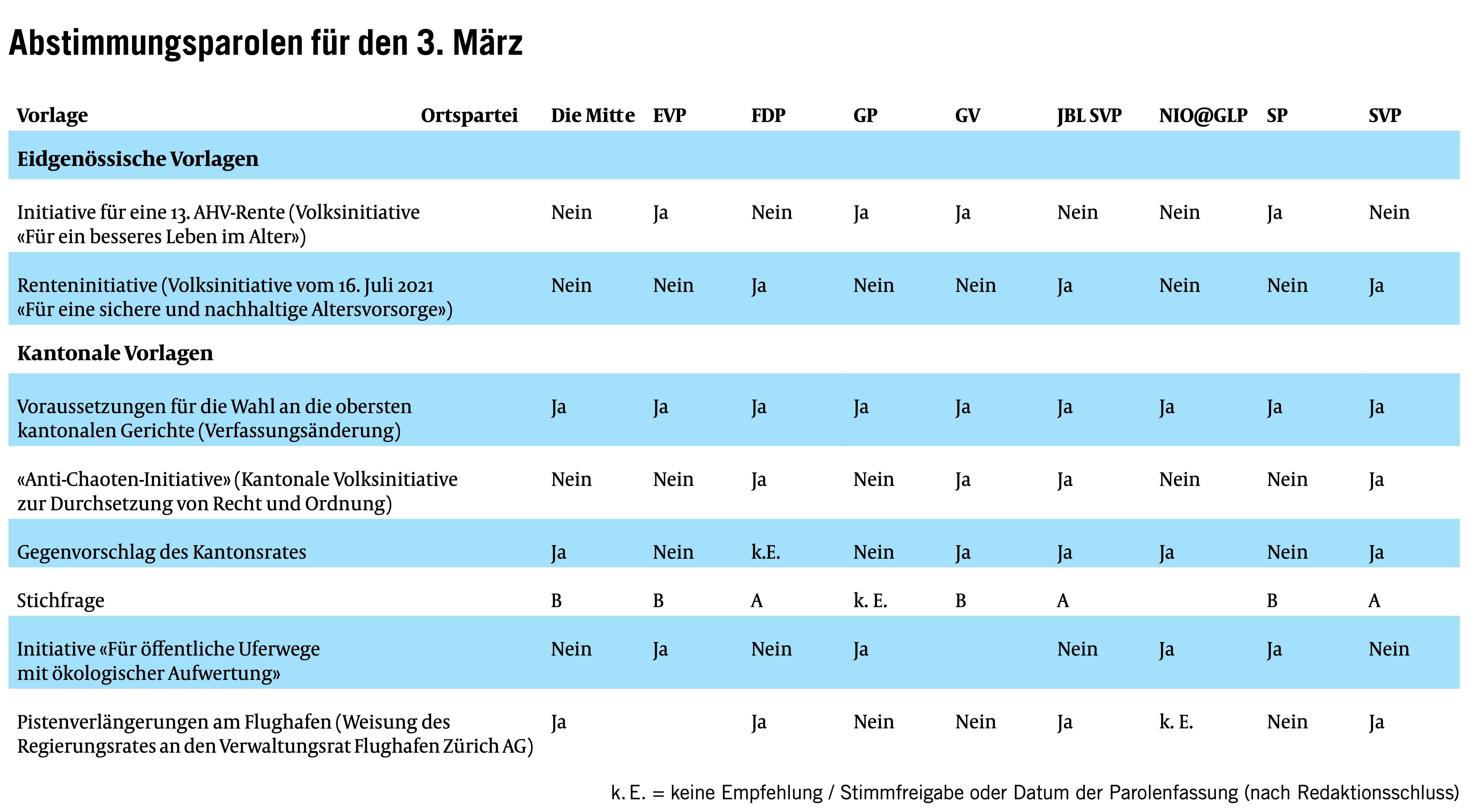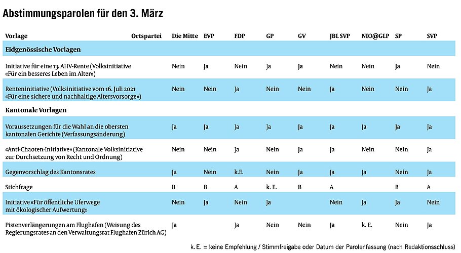 Die Opfiker Ortsparteien haben die Abstimmungsvorlagen vom 3. März beraten und empfehlen, folgendermassen abzustimmen.