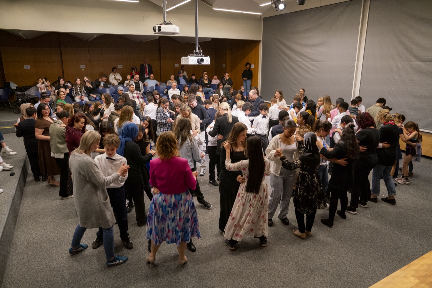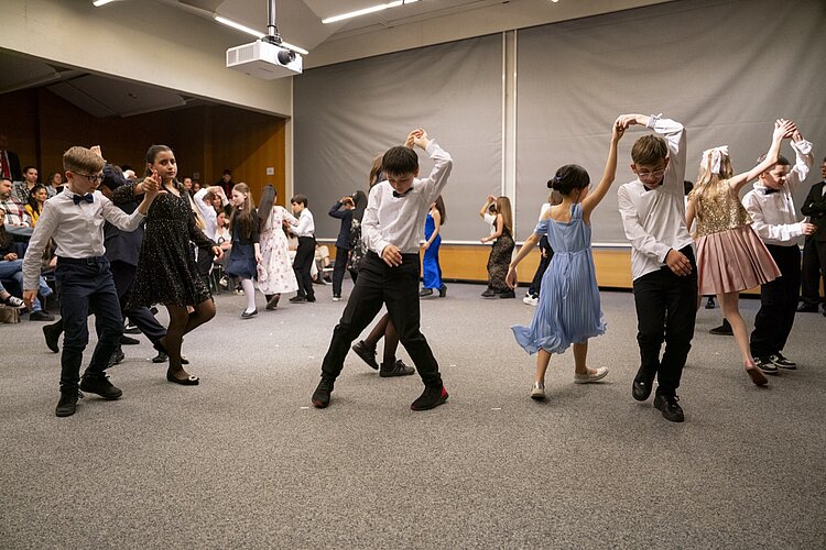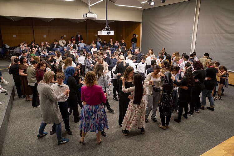 Im Anschluss darf auch das Publikum aufs Parkett. Die Fünftklässlerinnen und Fünftklässler tanzen mit ihren Eltern, Geschwistern oder anderen Familienangehörigen und werden kurzerhand selbst zur Tanzlehrerin oder zum Tanzlehrer.