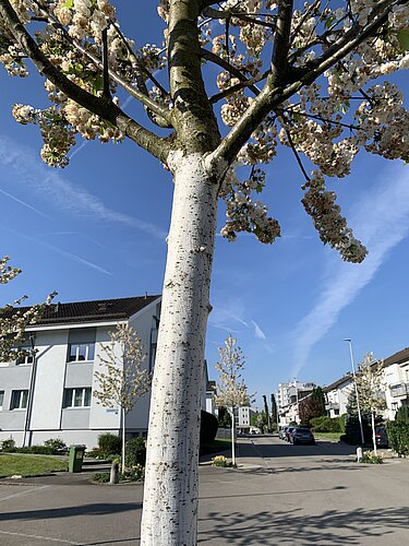 Aufmerksamen Spaziergängerinnen oder Joggern dürften sie auch schon aufgefallen sein: weiss gestrichene Bäume, etwa bei der Einmündung Kirchensteig/Wydackerstrasse. Das hat aber nichts mit Ästhetik oder verbesserter Sichtbarkeit zu tun, sondern mit der Sonnenhitze. «Der Anstrich ist ein Schutzanstrich», erklärt Patricia Meier, Leiterin der städtischen Abteilung Bau und Infrastruktur. «Er soll in erster Linie Frostrisse an den Baumstämmen infolge von starken Temperaturschwankungen verhindern und vor Sonneneinstrahlung schützen.» Die weisse Farbe reflektiert mehr Sonnenlicht und verhindert so, dass der Baum durch Hitze Schaden nimmt – gerade der Frühling mit grossen Temperaturunterschieden zwischen Tag und Nacht kann der Rinde zusetzen.
