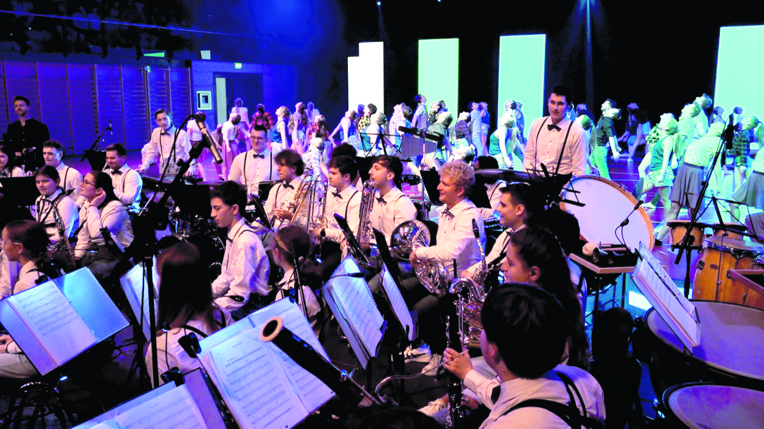 Seit den Sommerferien haben sowohl die Jugendmusik Glattal als auch die Turnvereine Dietlikon, Opfikon-Glattbrugg und Kloten an ihren jeweiligen Programmen gearbeitet – jetzt erstmals, am Tag vor der Premiere, trafen Musik und die Sportvereine aufeinander, um die Früchte der anderen einmal begutachten zu können. Fast vier Stunden dauerte die Hauptprobe und die Musizierenden als auch die Turnenden waren sich einig, dass ausreichend Erholung für den nächsten Tag nun essenziell sei.