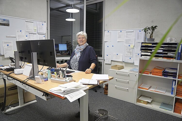 Während das «Erdgeschoss» des Erweiterungsbaues als gedeckter Parkplatz dient (der aber bei Bedarf dem Innenraum zugeschlagen werden könnte), wird der 1. Stock nun vom Steueramt genutzt, das vom bestehenden Gebäude hierher umgezogen ist. Gearbeitet wird hier nach wie vor im Grossraumbüro – auch auf Wunsch der Mitarbeitenden, wie Martin Pfenninger, Leiter des Steueramts, erklärt. Zwei abgetrennte Schalter garantieren die notwendige Diskretion.