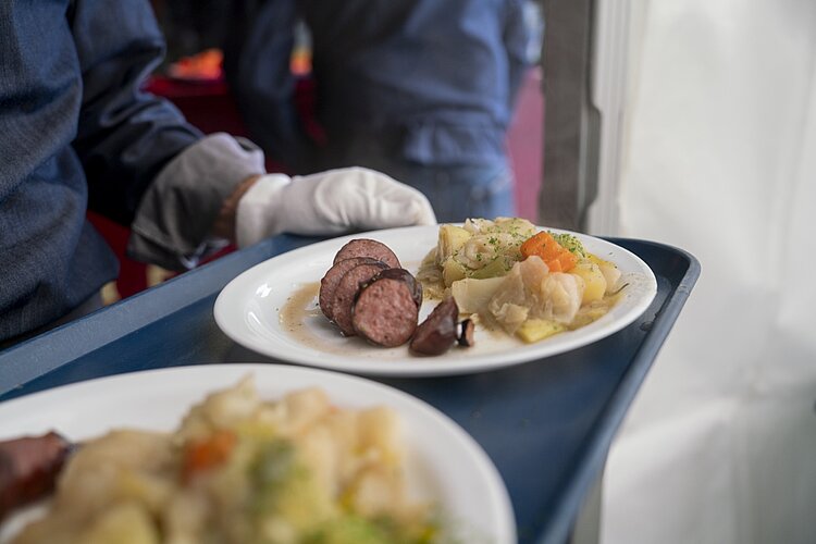 Während die Würste garen, köchelt nebenan das Gemüse im Kessel. Erst werden Zwiebeln angebraten, dann kommen der Kabis, die Karotten, die Kartoffeln und der Lauch dazu. Bouillon wird aufgegossen, alles gart über dem Feuer. Sind Wurst und Gemüse fertig, schneidet ein Koch die fertigen Würste zur Hälfte in Räder, richtet sie auf den Tellern an und schöpft das Gemüse dazu.
