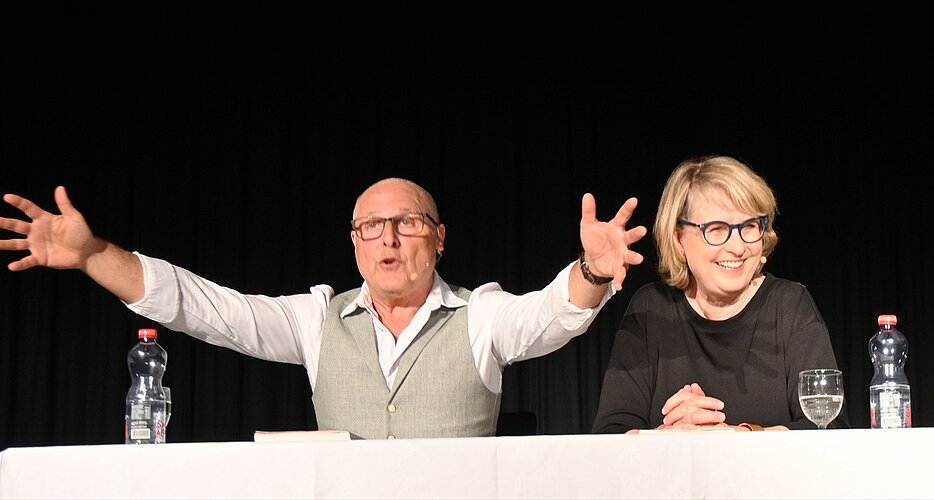 Dass es zwei Personen schaffen, zwei Stunden lang an einem Tisch zu sitzen, über ihre kleinen und grösseren Stolpersteine im Ehealltag zu sprechen und damit das Publikum wunderbar zu unterhalten und zum Lachen zu bringen, ist schon hohe Comedy-Schule. Dabei sind die beiden absolut keine «Chiflers», die sich gehässig gegenseitig Vorwürfe an den Kopf schleudern. Nein, ihre Dialoge können zwar bissig sein, sind aber getragen von gegenseitigem Respekt und viel Humor. Und den braucht es gemäss Schreiber und Schneider auch, um den «Paarcours d’amour» ein gemeinsames Leben lang zu überstehen. Zugegeben, Sybil Schreiber ist als Deutsche mit geschliffenem Mundwerk Steven Schneider, dem Halbitaliener, wie er stolz betont, mit dem gemütlichen Schweizerdialekt verbal überlegen. Mit grosser Mimik und Gestik spricht er über seine Empfindlichkeiten, wird von ihr aber nicht selten mit einem knappen Satz mundtot gemacht. Zum Beispiel, als er verspricht, vermehrt in sich zu gehen, lautet ihre Antwort: «Ist ja auch kein weiter Weg.»