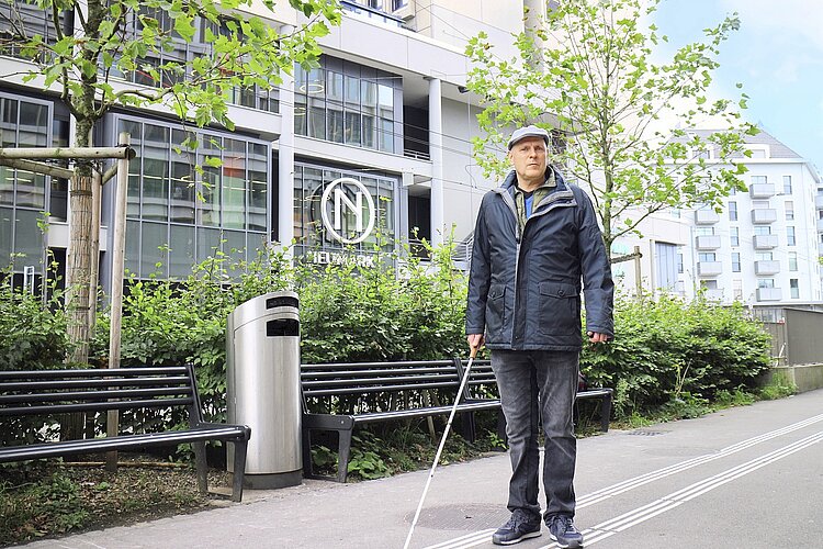 Zwischen den E-Trottinetts am Bahnhof Oerlikon stehen zwei sogenannte Dialoger mit roten Westen, sie sprechen Passantinnen und Passanten an und werben für Spenden. Eine Stimme ruft, ein Lachen, dann das sirrende Surren eines Rollkoffers. Zwischen all dem bewegt sich Reto Frey. Der weisse Stock tastet ruhig den Boden ab, die Bewegung präzise. Ein Dialoger spricht ihn an, freundlich überrascht. Reto Frey lacht, weicht elegant aus. Er hat Übung darin, sich durch wuselige Menschenmengen zu bewegen.