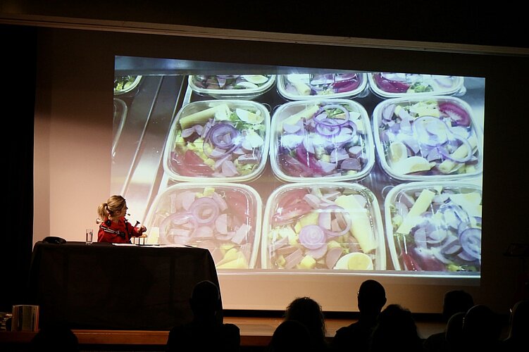 Lara Stoll beginnt nahe, sehr nahe. In ihrem Kapitel „Salat“ seziert sie das Gemüse nicht kulinarisch, sondern wie eine Komposition. „Ein griechischer Salat sieht eigentlich aus wie ein Gemälde von Kandinsky“, sagt sie. Noch bevor das Publikum klärt, ob Kandinsky Impressionist oder Expressionist war (Letzteres), steht Stoll in der Erzählung bereits an der Migros-Kasse, hinter ihr eine langsam ungeduldige Schlange. Sie hat zu lange über die Ästhetik der Salattheke nachgedacht. Zu präzise, zu lange, zu tief. Dieses leichte Kippen des Alltäglichen in etwas Eigenwilliges – und wieder zurück in eine sehr schweizerische Szene – ist Lara Stolls Markenzeichen.