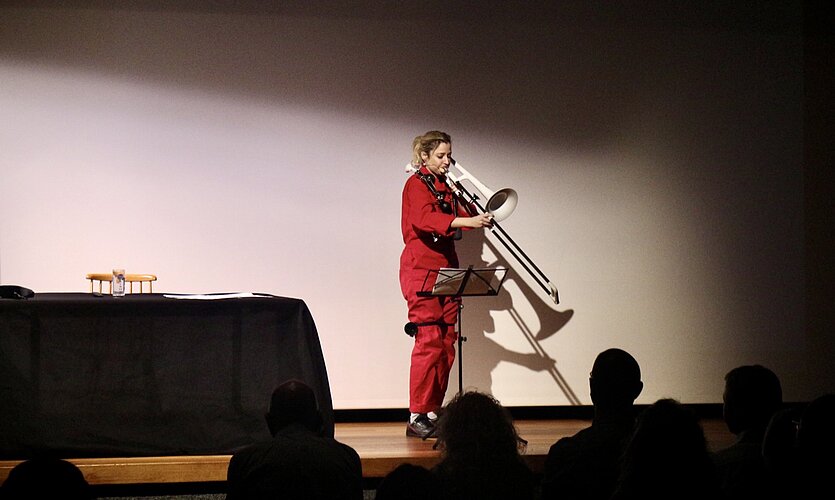 «Ich erzähle Dinge, die wirklich passieren könnten», sagt sie später. Und genau das erzeugt die Komik: Sie könnten. Vielleicht sind sie es schon. Der Abend pendelt zwischen Bewegung und Stillstand: Herumlaufen auf der Bühne, das Wechseln der Instrumente, dann wieder die auf Hochdeutsch gelesenen Texte am Tisch – Relikte ihrer Slam-Poetry-Jahre, die im Rhythmus durchschimmern.