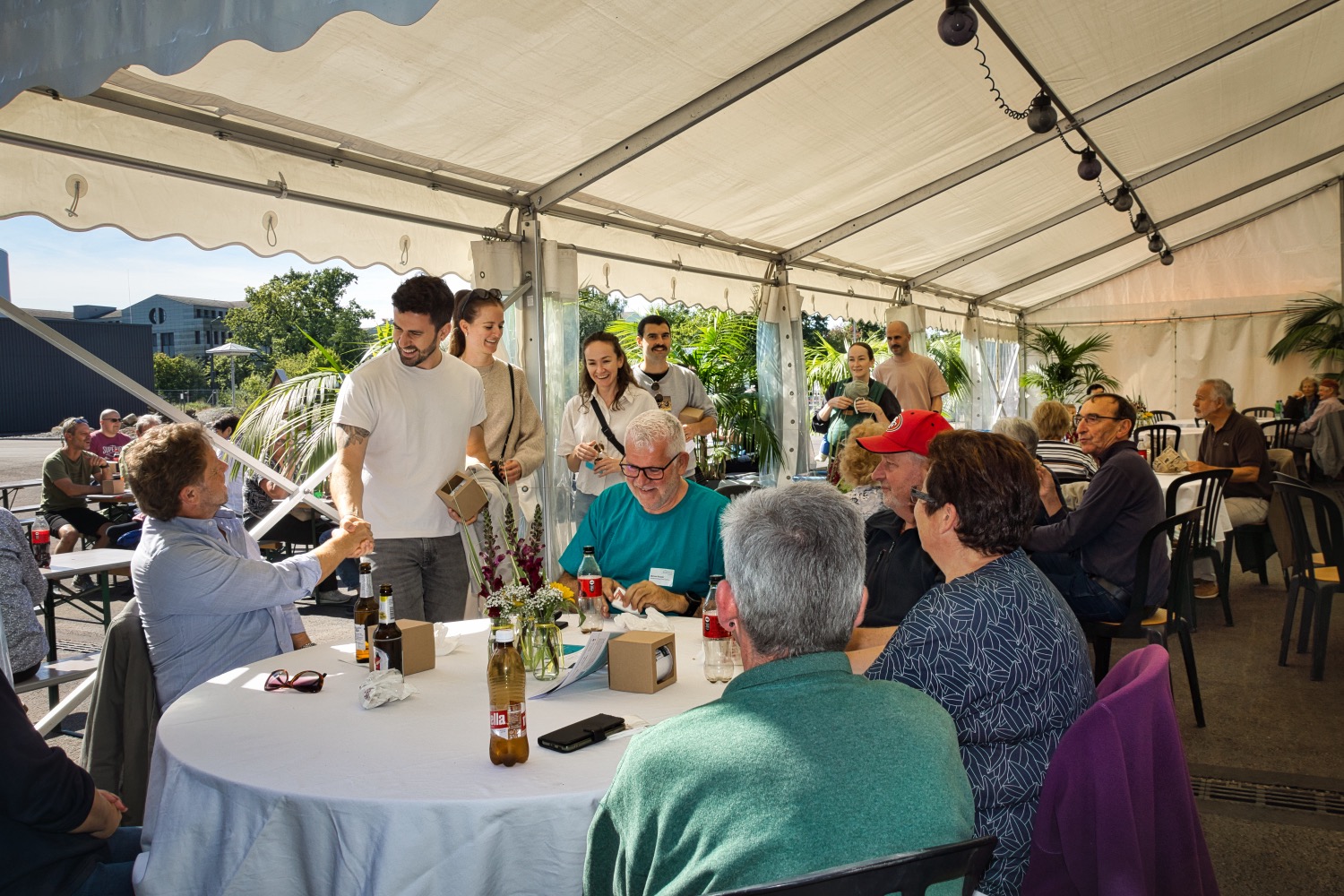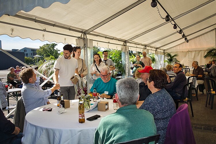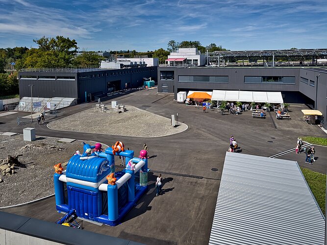 Nach dem Rundgang gab’s feines Essen und Getränke im oder vor dem Festzelt. Viele Gäste nutzten die Gelegenheit zum gemütlichen Zusammensein. Und für die jüngeren Besucherinnen und Besucher waren sicherlich auch die Hüpfburg und das Bungee-Trampolin zwei weitere Höhepunkte. Eine Familie meinte lachend, jetzt seien nicht nur genug Eindrücke gesammelt, sondern auch genug Schritte auf der Trackeruhr. Und für einen anderen Gast war klar: «Wir haben wirklich eine schöne Kläranlage.»