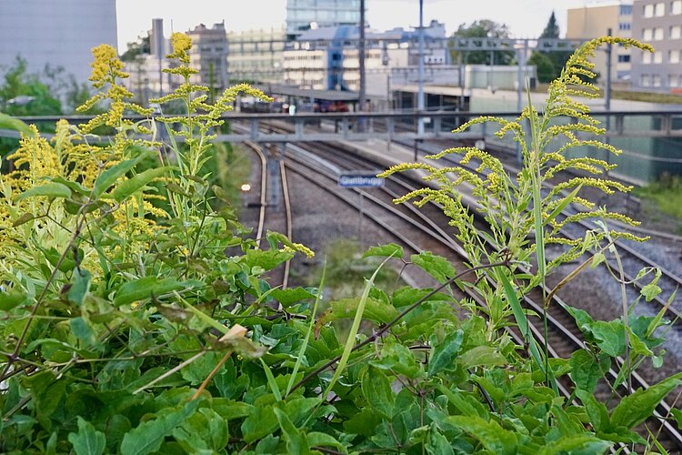 So darf etwa der beliebte Sommerflieder, einst als «Schmetterlingsstrauch» gepriesen, ab 1. September nicht mehr verkauft, aber im eigenen Garten weiterhin gepflegt werden. Wer solch eine Pflanze im Garten hat, muss gemäss Sorgfaltspflicht dafür sorgen, dass die Pflanze sich vom Garten aus nicht weiterverbreitet. Für den Sommerflieder und den Kirschlorbeer bedeutet das, die Blütenstände nach der Blüte und vor der Samenreife abzuschneiden und im Kehricht zu entsorgen. Darüber hinaus gibt es rechtlich keine Handhabe: An Bahnborden und Strassenrändern sollte man auch offiziell Invasives nicht einfach ausreissen. Verantwortlich sind hier die Grundbesitzer, also etwa die SBB, der Kanton oder das Bundesamt für Strassen. Alle drei haben kaum die Mittel, wirksam gegen die Gewächse vorzugehen. «Einmaliges Ausreissen bringt bei fortgeschrittener Ausbreitung leider nichts, es braucht dann mehrmals jährlich eine Bekämpfungsaktion, und dies mehrere Jahre lang, um einen invasiven Art nachhaltig zu bekämpfen», weiss Eva Bantelmann. Die Gruppe ist inzwischen bei der Brücke angelangt, wo die Schaffhauserstrasse über die Trassen von Glattalbahn und SBB führt. Am Bahndamm spriessen die Amerikanische Goldrute und das Einjährige Berufkraut im Dutzend und werden fürs nächste Jahr viele weitere Samen bilden.