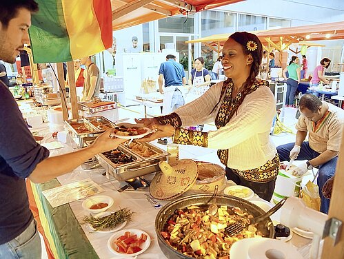 Das 10. Food-Festival Opfikon fand zum ersten Mal im Graffland statt. So gesellten sich zu bunten Kunstwerken aus aller Welt ebensolche Gerichte.