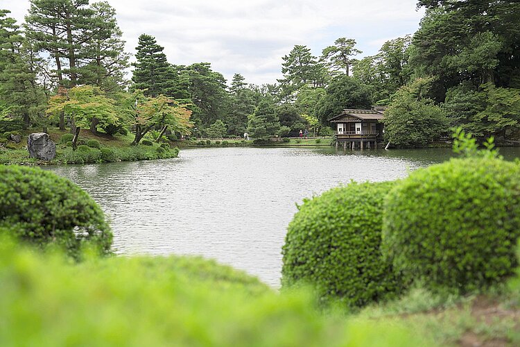 Direkt nebenan liegt der Kenrokuen-Garten, einer der drei schönsten Landschaftsgärten Japans. Der Name bedeutet «Garten der sechs Erhabenheiten» und bezieht sich auf Landschaftsattribute wie Weitläufigkeit, Wasserreichtum und Aussicht. Angelegt wurde er über einen Zeitraum von fast 200 Jahren.