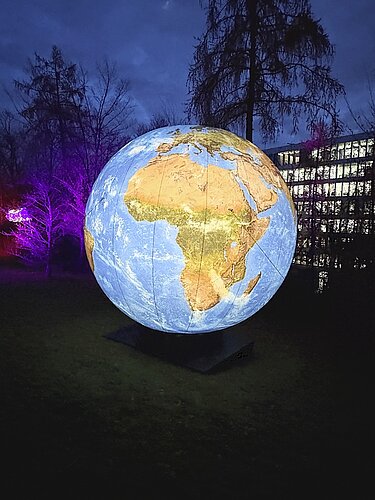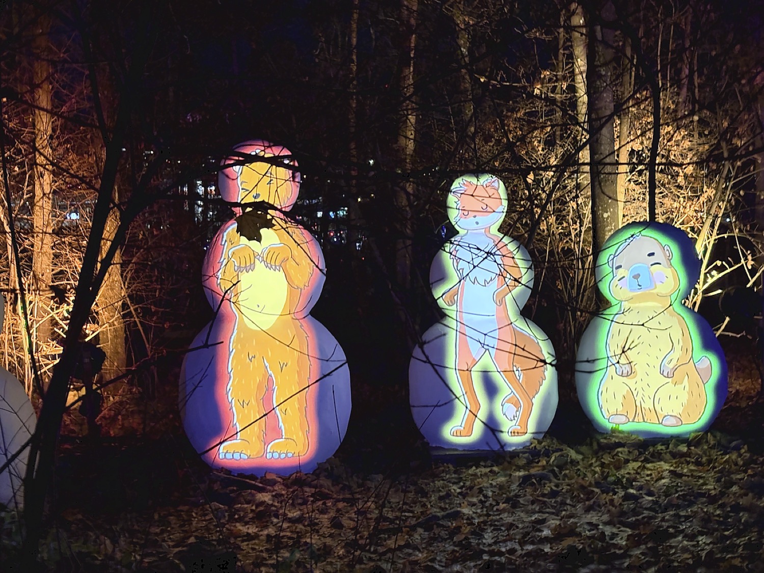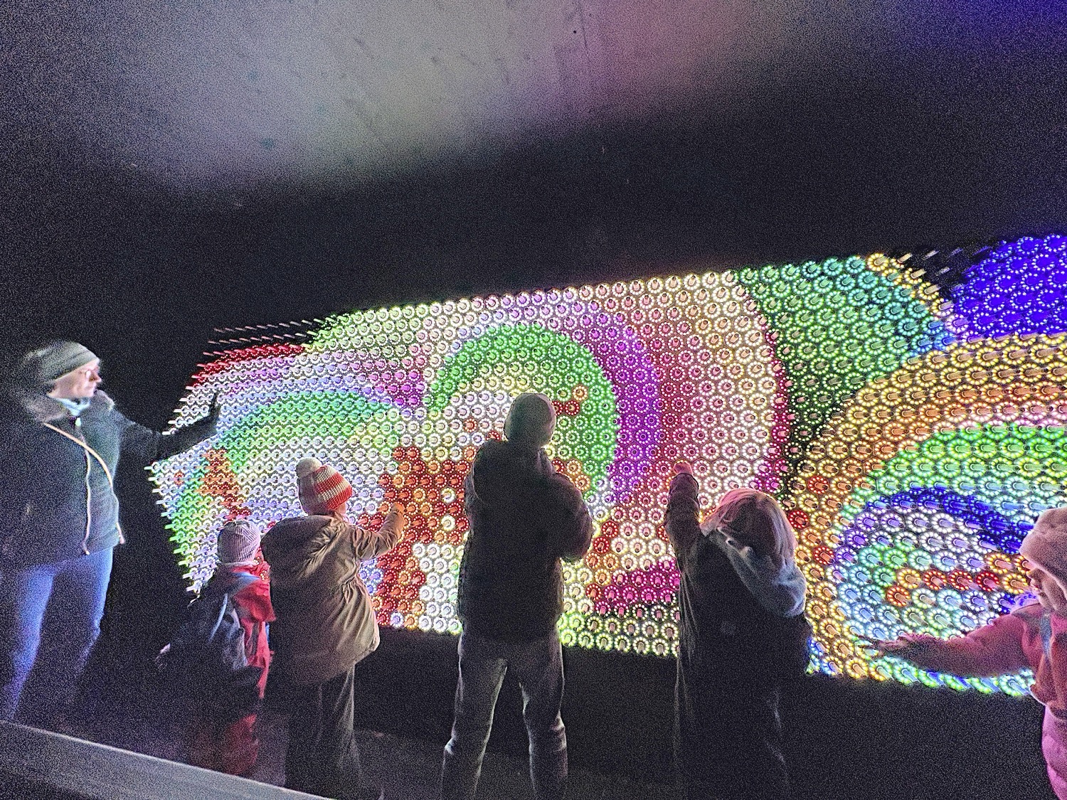 «Oh Tannenbär, oh Tannenbär, wie Müde macht die Kälte», so ist eine etwas kreischende, beinahe unverständliche Stimme aus dem Wald zu hören. Sie stammt von sechs unterschiedlich grossen Schneefiguren, die sich in chaotischer Weise in ihre Lieblingstiere verwandeln und dabei ihre eigenen Interpretationen von bekannten Weihnachtsliedern singen. So wird Jingle Bells: «Jingle Bock, Jngle Bock, winterliches Glitzern, hab keinen Bock auf all den Weihnachtsstress und all die Lichterblitzer.» Die Lichtinstallation Frostorchester Schabernack des Zürcher Kreativteams Nachtlicht ist eine von 16 leuchtenden Kunstwerken, die derzeit auf dem Butzenbüel hinter dem «Circle» zu bestaunen sind. Es geht dabei nicht immer laut und hell zu und her, wie beim Frostorchester. Oft sind die Installationen mit leiser, harmonischer, fast psychedelische Musik unterlegt, die von irgendwoher aus einem Lautsprecher schallt.