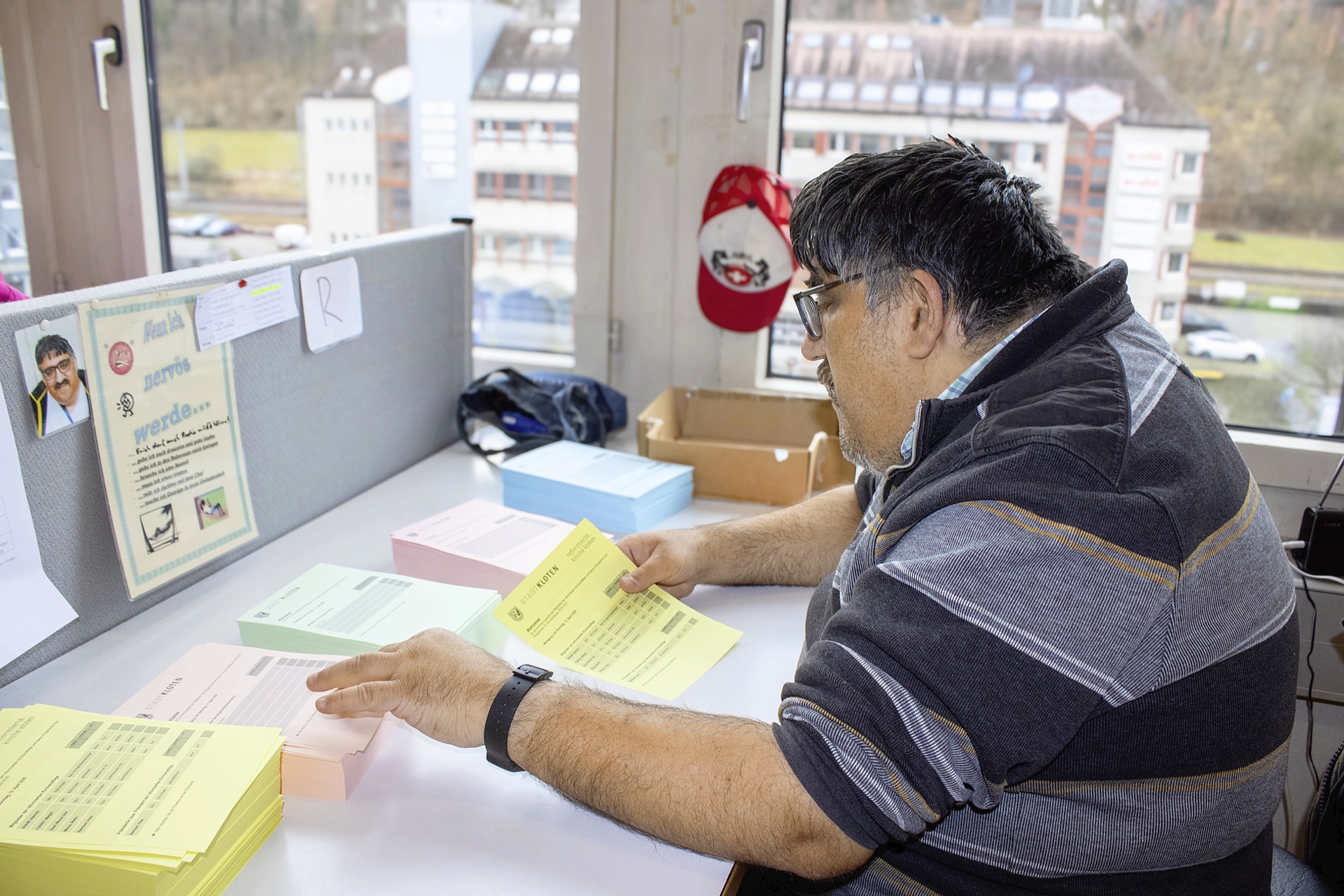 Verpackungsarbeiten gehören zum festen Angebot der Pigna-Werkstätten. Wahl- und Abstimmungsunterlagen sind dabei ein besonderer Auftrag, sagt David Bücheler, Gruppenleiter in der Werkstatt Müliwies. Seit rund 20 Jahren begleitet er diese Arbeiten. «Das Schwierige bei den Wahlen sind die verschiedenen Couverts», erklärt er. Je nach Konfession der Wahlberechtigten und Zusammensetzung variiert der Inhalt. Der Arbeitsablauf ist klar geregelt. Fertig bestückte Couverts werden kontrolliert, unter anderem mit einer Präzisionswaage. «Wir wiegen jedes Couvert», sagt David. So lasse sich erkennen, ob Unterlagen fehlen oder zu viel enthalten sind. Da die Gewichtskontrolle nicht in allen Fällen ausreicht, werden zusätzlich Sichtkontrollen vorgenommen.