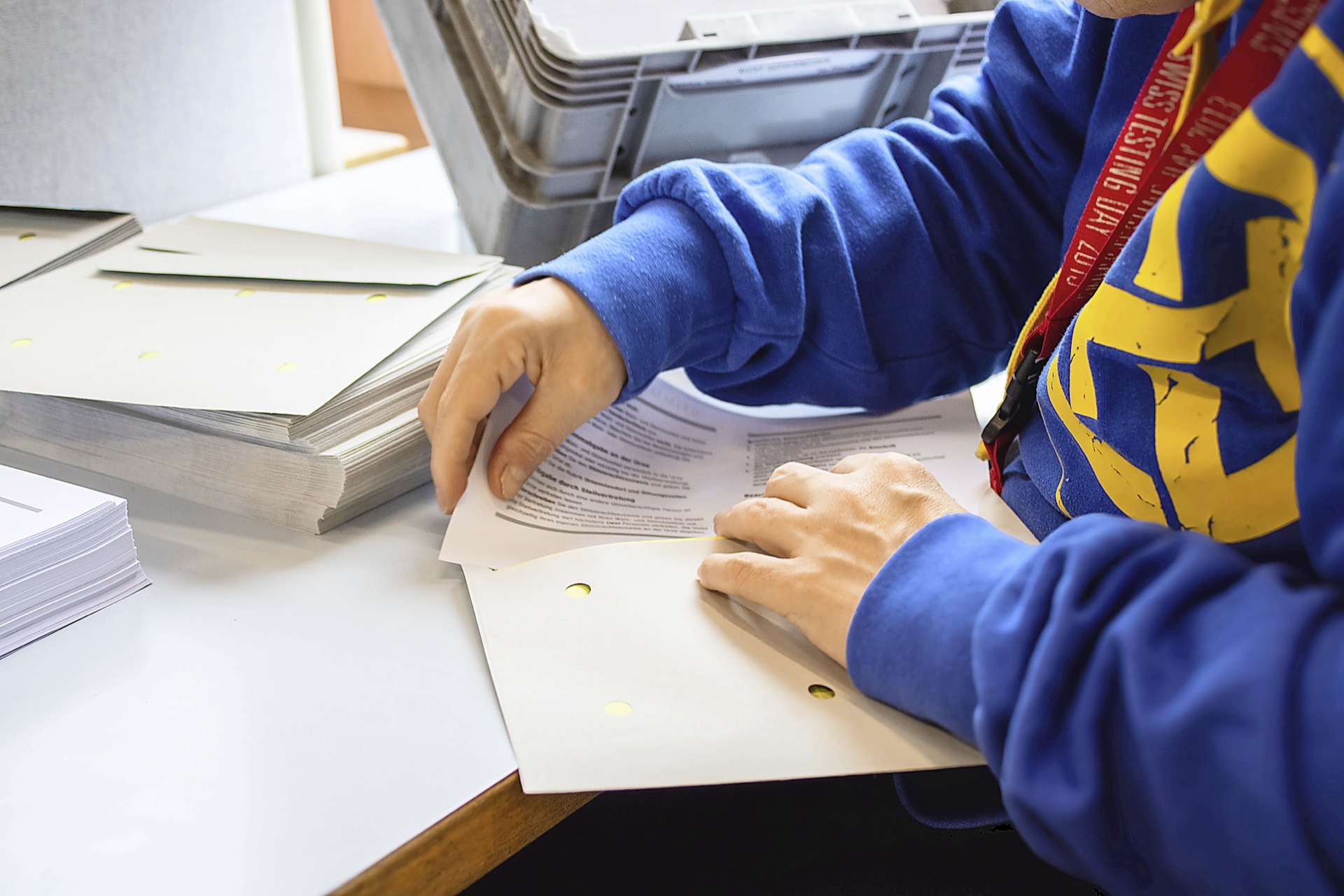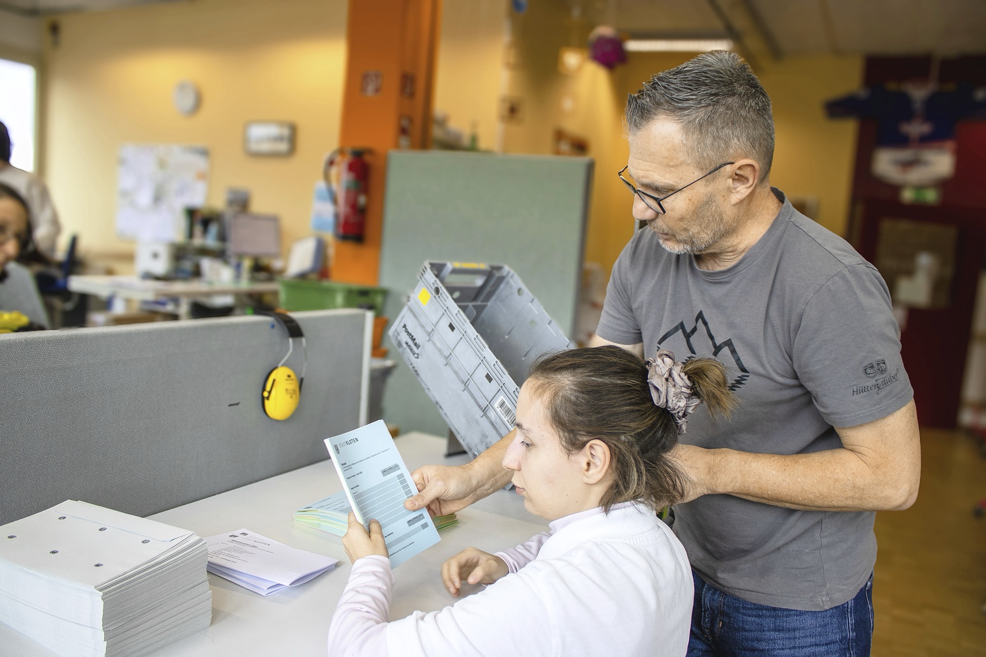 Bevor Wahlunterlagen in den Briefkästen landen, gehen sie durch viele Hände. In der Werkstatt Müliwies der Stiftung Pigna in Kloten verpacken Menschen mit Beeinträchtigung Couverts mit Wahlzetteln und Wahlpropaganda.
