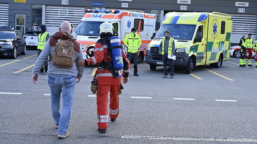 Im Zentrum der Übung «Forza25» stand eine Einzeltäterin, die «vorsätzlich an mehreren Orten des Flughafengeländes sicherheitsrelevante Zwischenfälle herbeiführte und dadurch eine komplexe Gefahrenlage mit mehreren Verletzten verursachte», wie die Flughafen Zürich AG mitteilt. Dazu gehörten Feuer, ein Verkehrsunfall sowie eine Bedrohungslage in einem am Boden stehenden Flugzeug.