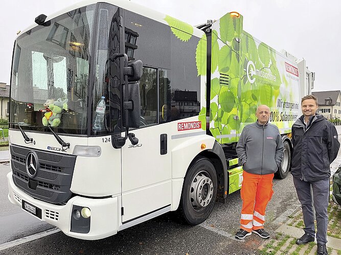 Das Grüngut wird ebenfalls mit diesen Elektro-Fahrzeugen abgeholt – einzig die monatlichen Abfuhren, bei denen auch die Container geputzt und ausgespritzt werden müssen, werden noch mit Dieselfahrzeugen gemacht, weil diese eine spezielle Vorrichtung für die Hochdruckreinigung haben. Eine entsprechende Umrüstung wird aber auch hier geprüft. «Wir sind die ersten, die elektrische Abfuhrwagen von Mercedes in der Schweiz einsetzen», erklärt Vertriebsleiter Raphael Simonelli.