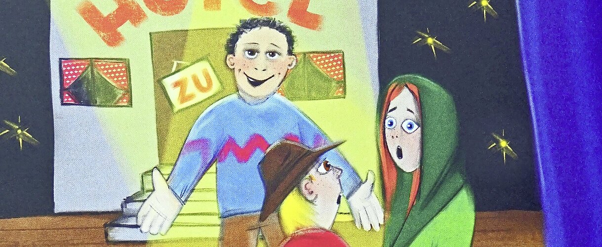 Doch plötzlich verschwand der dunkle Schatten von seinem Gesicht, ja, es begann förmlich zu leuchten. Und Roberto sagte mit fester Stimme: «Kommt nur herein, ich gebe euch mein bestes Zimmer!» und bevor der Lehrer vor Schreck beinahe vom Stuhl fiel, fuhr der kleine Roberto fort: «Und zu essen bekommt ihr auch, so viel ihr wollt!» und er ergriff Maria sanft bei der Schulter und wollte sie durch die Kulissentür in sein Gasthaus führen.