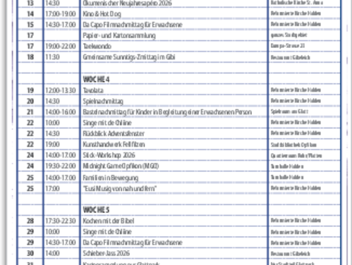 Sonntag, 18. Januar 202611.30 Uhr, AZ Gibeleich, Restaurant'Gmeinsame Sunntigs-Zmittag im Gibi'Der 'gmeinsame Sunntigs-Zmittag' im Restaurant…Weiterlesen -