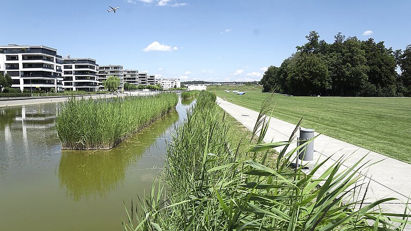 Hätten es ein, zwei Blöcke mehr getan? Der künstliche See und der Park im Glattpark werden in der Studie zwar gelobt – zugleich aber stellen sich die Studienautoren die Frage, ob an so zentraler Lage nicht zu viel Fläche unbebaut bleibt. Bild Roger Suter -