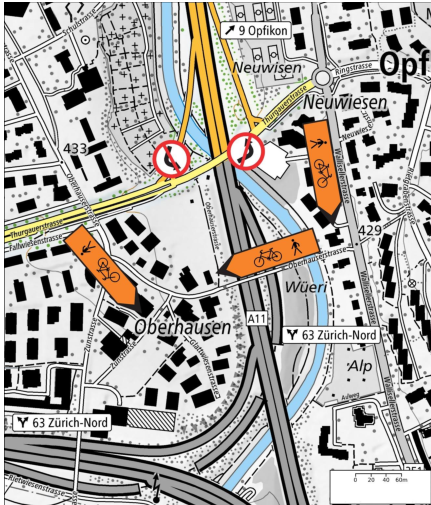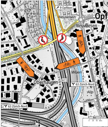 Der Velo- und Fussverkehr wird über die Walliseller- und die Oberhauserstrasse umgeleitet. (pd.)