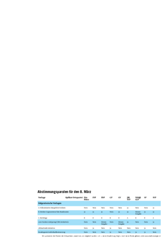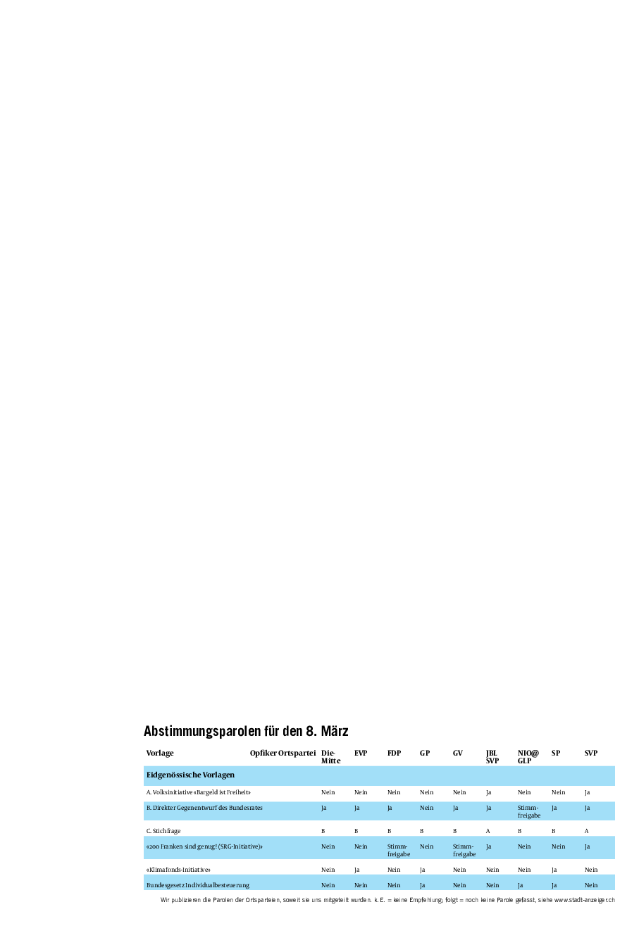 Die Ortsparteien Opfikons geben jeweils vor Abstimmungen Empfehlungen heraus. Der «Stadt-Anzeiger» sammelt und veröffentlicht diese jeweils.
